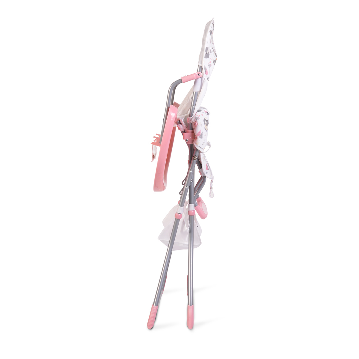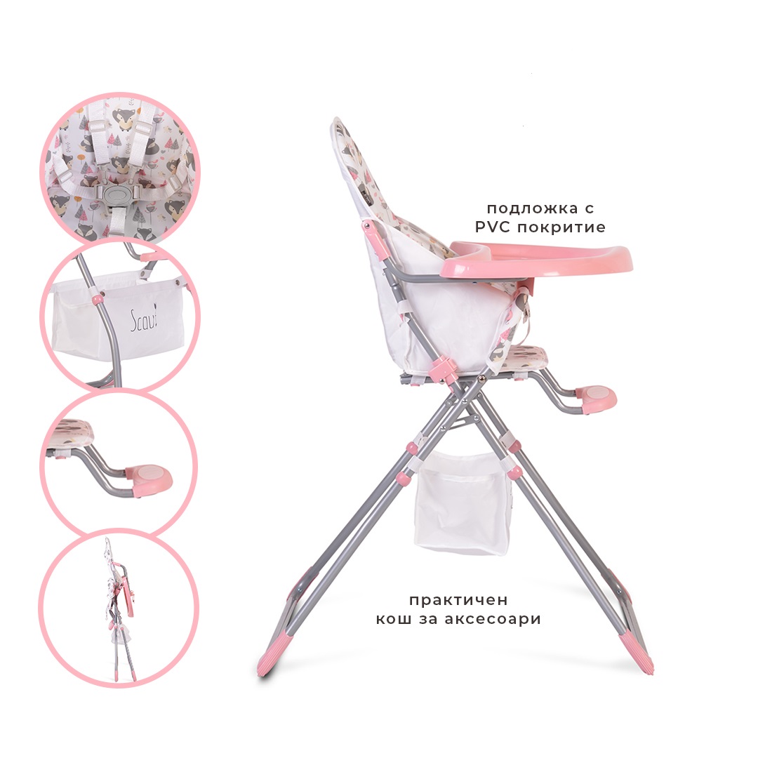 The high chair is intended for children over 6 months and with a maximum weight up to 15 kg. Compact design. Easy folding and unfolding. The product has an accessory basket. PVC coated seat pad for easy cleaning. Fresh design and pleasant colors. The product is equiped with 5 – point safety harness
