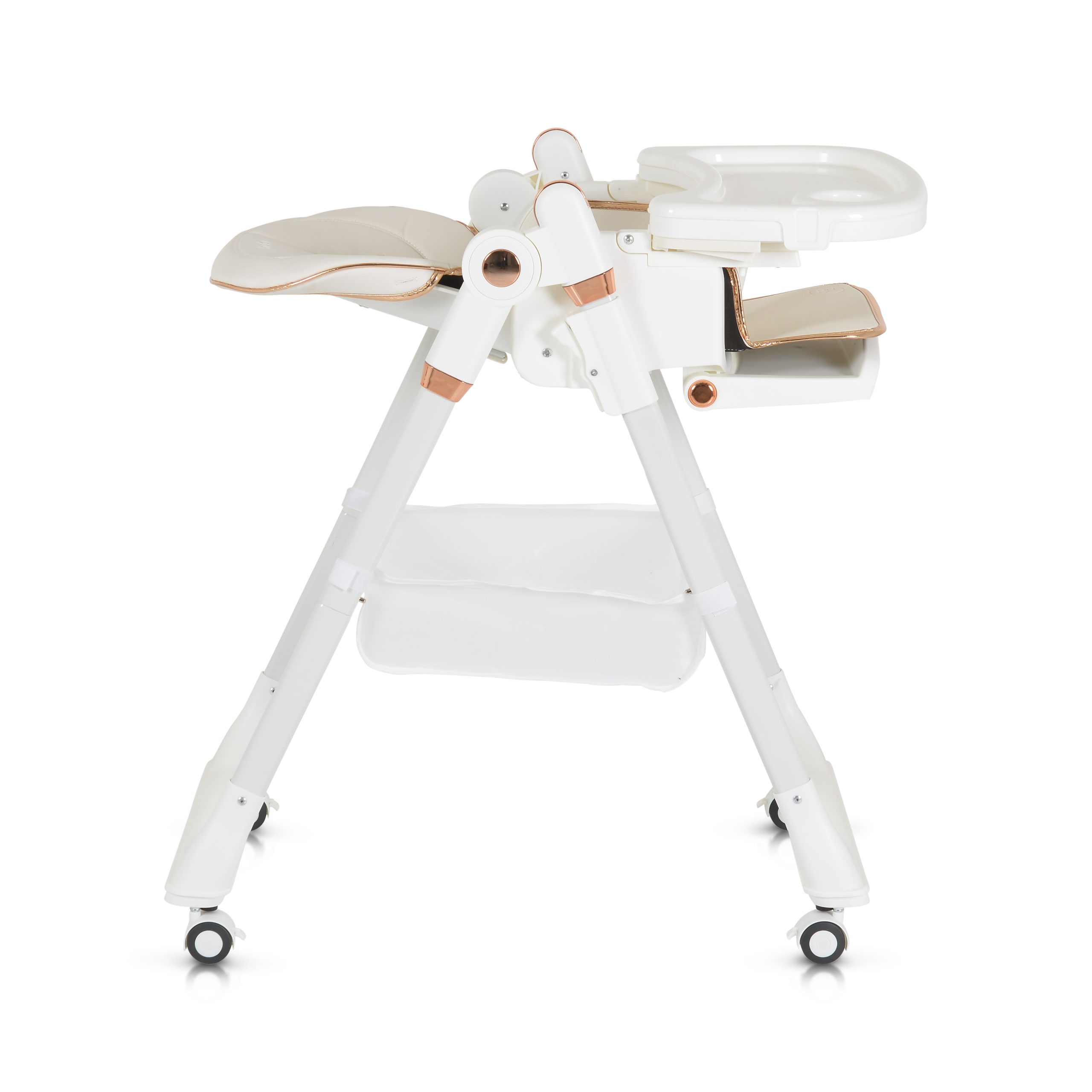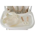 Set of high chair, silicone bib, spoon and fork;PU cushion;4 wheels with stoppers;2-layered feeding tray;4 positions of the feeding tray;3 positions of the backrest;5 height positions;3 positions of the angle of the footrest;Shoulder pads;5-point restraint system.