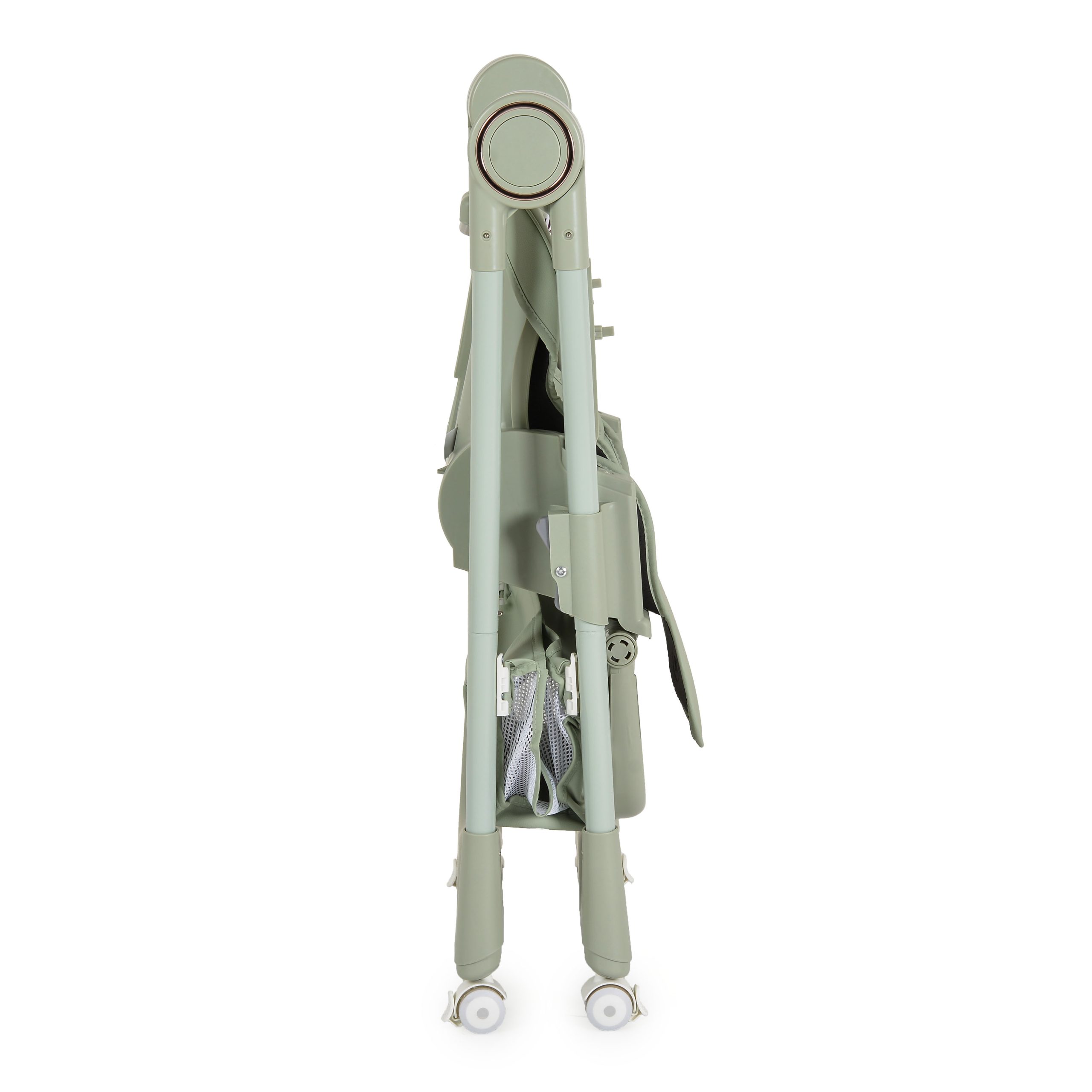 The Surprise high chair is a fully equipped feeding solution including a seat cushion, bib, bowl, spoon, and fork. It features a double tray with 3 positions, 7 height levels, 5 recline angles, and a 3-position footrest. The chair is fitted with a leather accessory basket with a hard base, 4 silicone wheels with brakes, and is made from easy-to-clean materials. Compact and functional, ideal for everyday use.