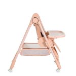 The Surprise high chair is a fully equipped feeding solution including a seat cushion, bib, bowl, spoon, and fork. It features a double tray with 3 positions, 7 height levels, 5 recline angles, and a 3-position footrest. The chair is fitted with a leather accessory basket with a hard base, 4 silicone wheels with brakes, and is made from easy-to-clean materials. Compact and functional, ideal for everyday use.