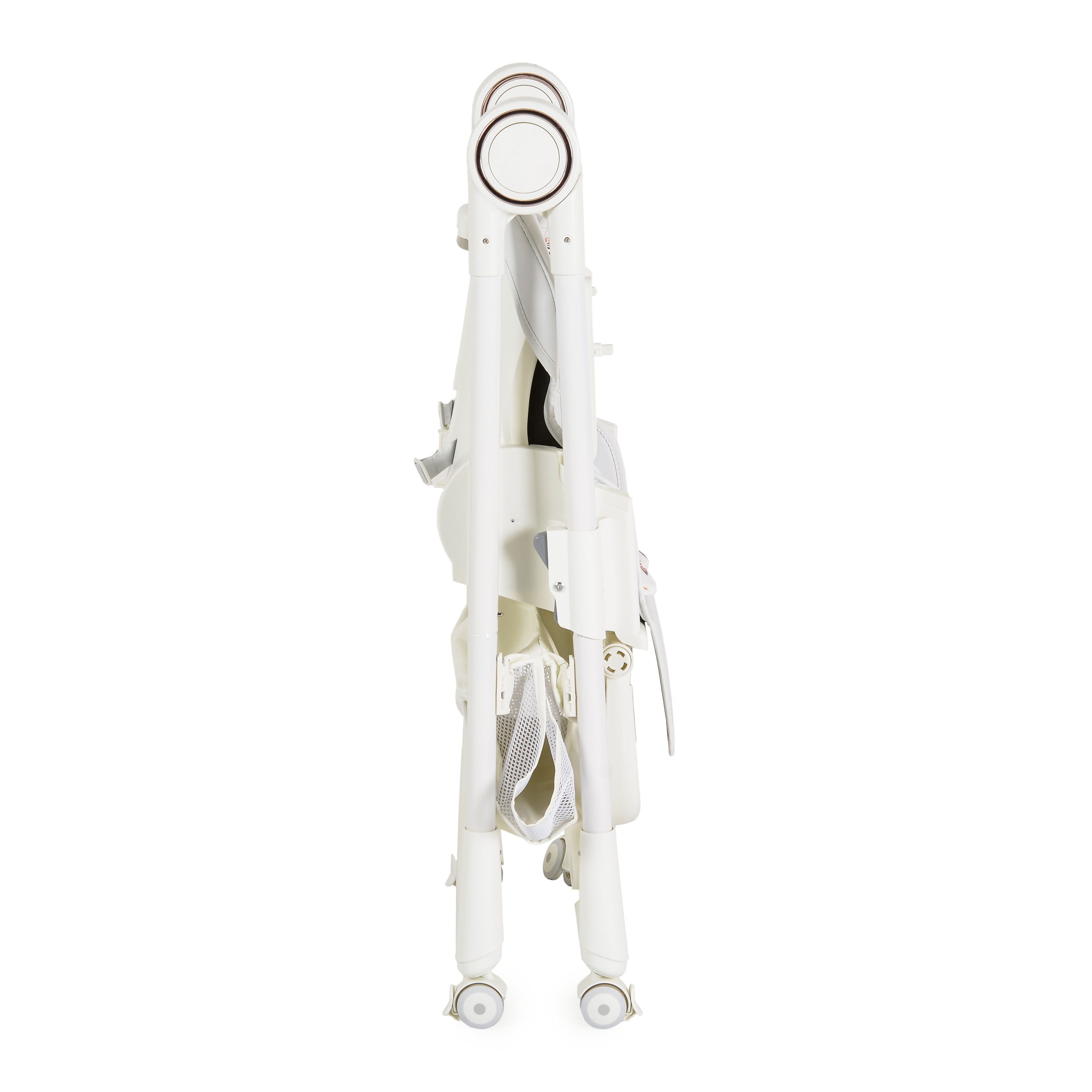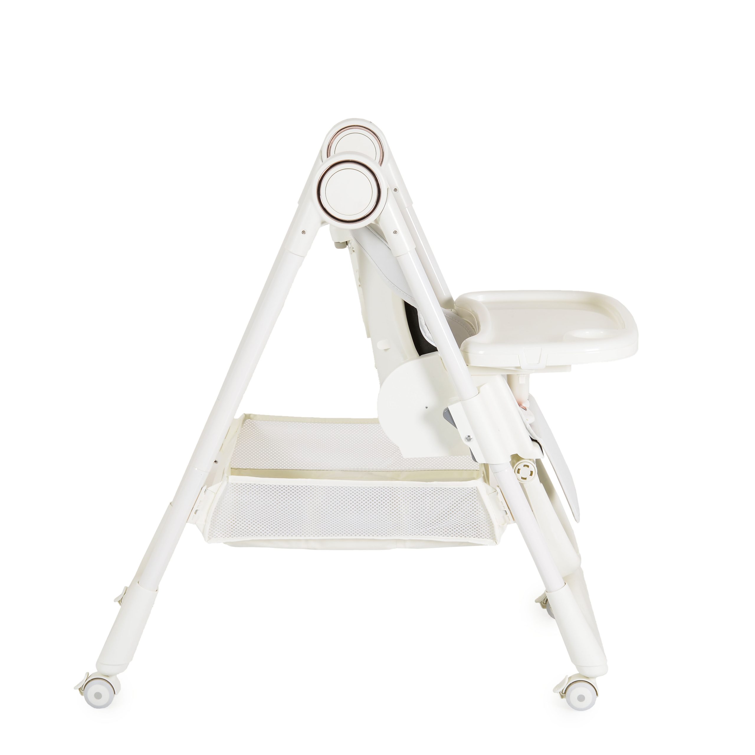 The Surprise high chair is a fully equipped feeding solution including a seat cushion, bib, bowl, spoon, and fork. It features a double tray with 3 positions, 7 height levels, 5 recline angles, and a 3-position footrest. The chair is fitted with a leather accessory basket with a hard base, 4 silicone wheels with brakes, and is made from easy-to-clean materials. Compact and functional, ideal for everyday use.