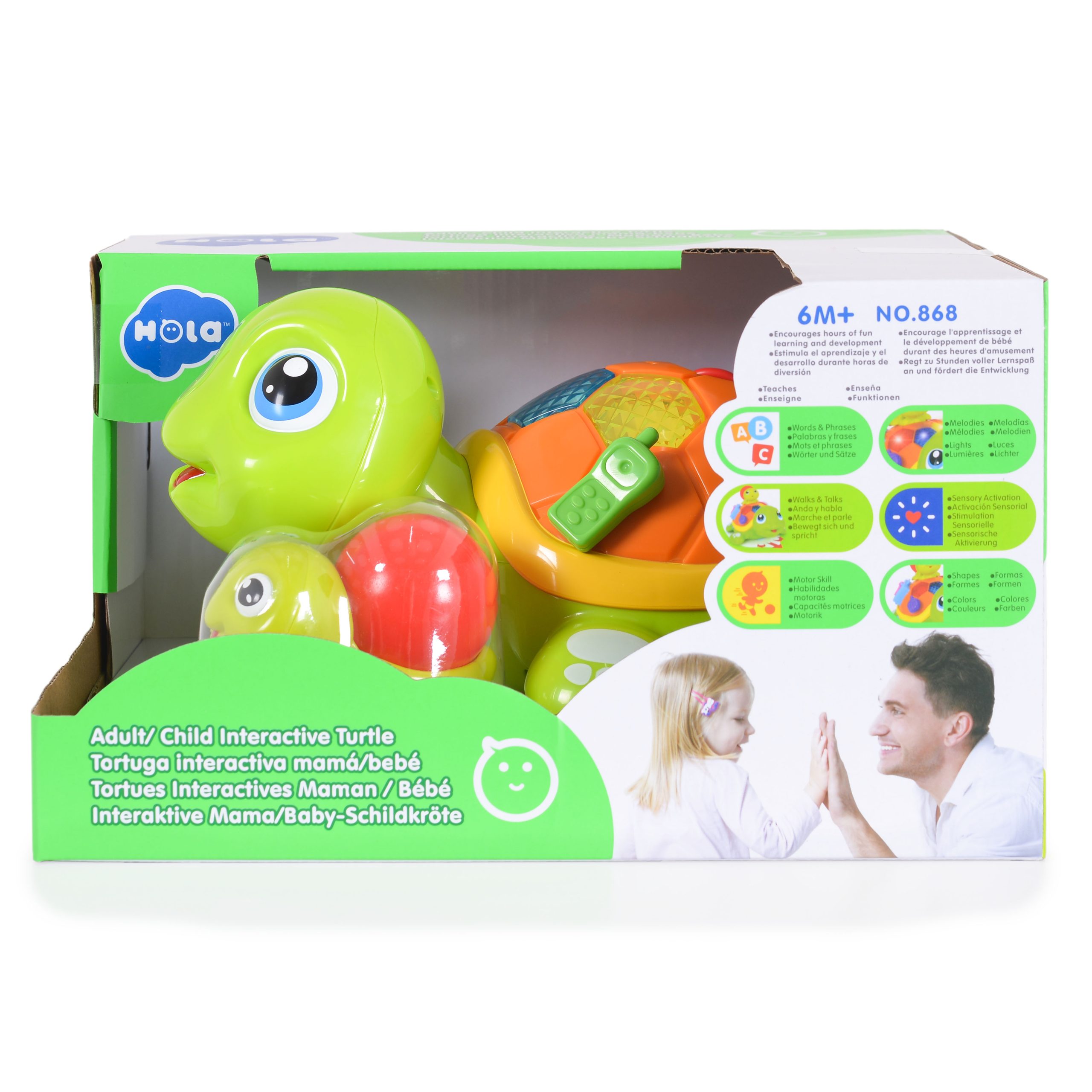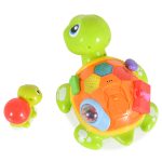 Interactive educational game turtles – dad and baby. The toy is extremely fun. Stimulates baby to crawl or walk, push buttons and develop fine motor skills. Stimulates speech in children. The baby turtle attaches itself to daddy`s back. They walk, they talk, there are tunes and lights. Baby attaches with a magnet to dad`s tail. Built-in sensors reproduce reactions of surprise and joy.
