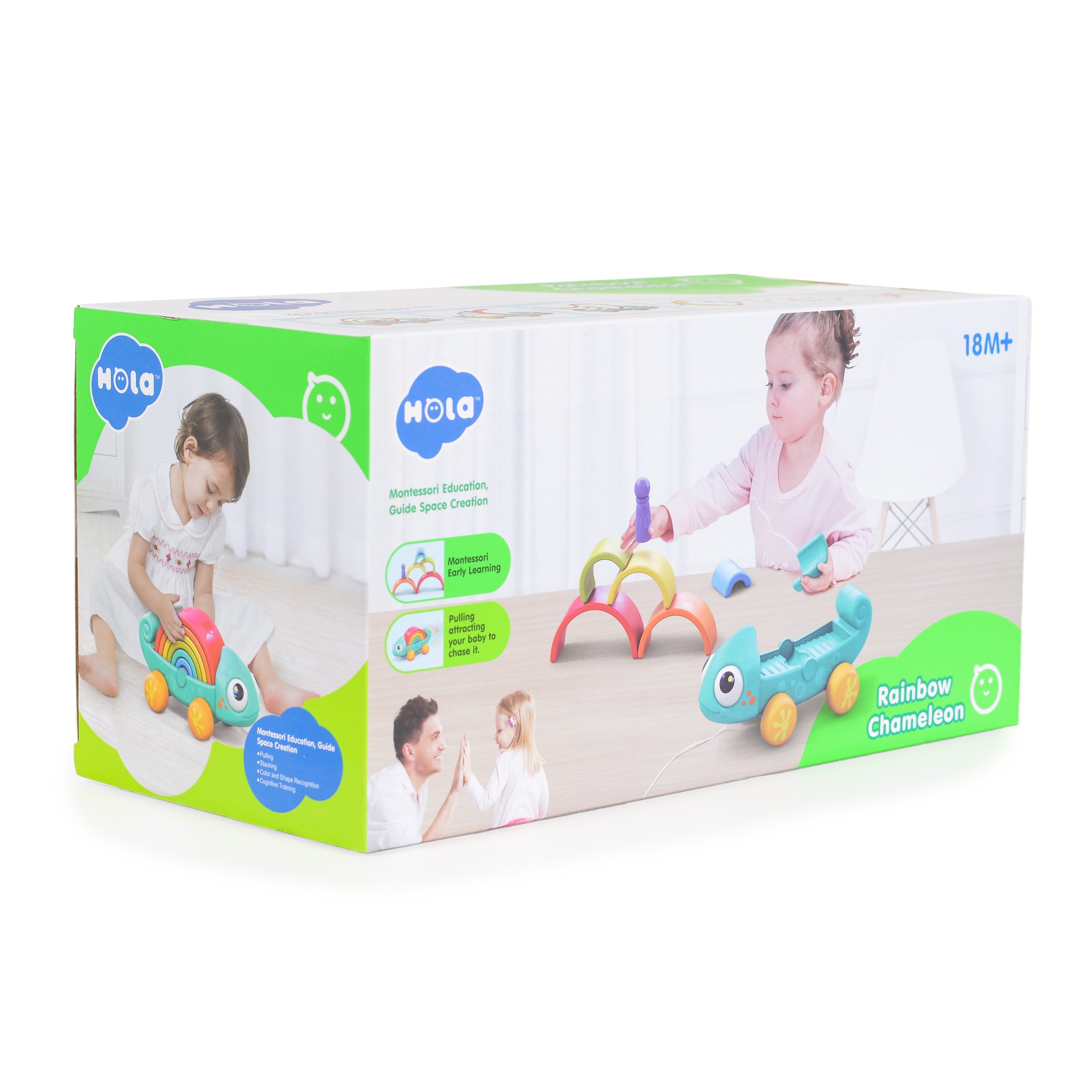 Hola Toys – Chameleon 3-in-1 (HA795700) is a multifunctional educational toy that combines three activities in one – a pull-along toy, a stacking pyramid, and a construction set. Suitable for children over 18 months, it supports the development of motor skills and coordination during the first steps, as well as learning basic shapes and colors through stacking elements. The toy stimulates logical thinking and imagination, is made of safe materials, and features a bright and attractive design.