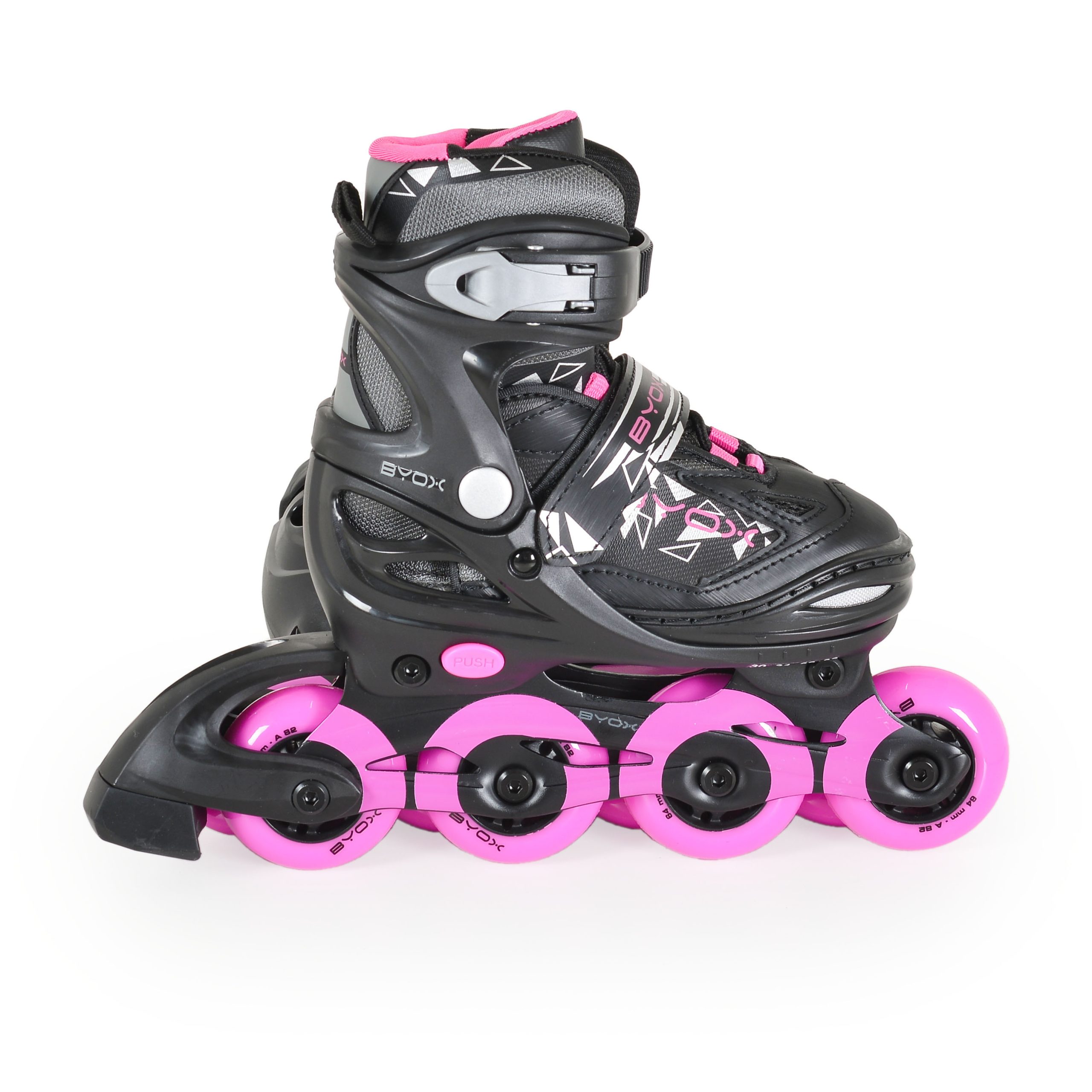 Adjustable inline skates equipped with system for adjustment of the size in four stages: size S from 30 to 33. Suitable for children aged above 3 years and weighing up to 60 kg. These inline skates have 4 PU 82A wheels with size 64*24mm with ABEC-5 bearings. The inline skates are with light Aluminum molded wheel frame and PVC stopper, PP cuff and shell. The fastening is with laces, Velcro strap and doubly secured buckle. The skates are packed in a carry bag.