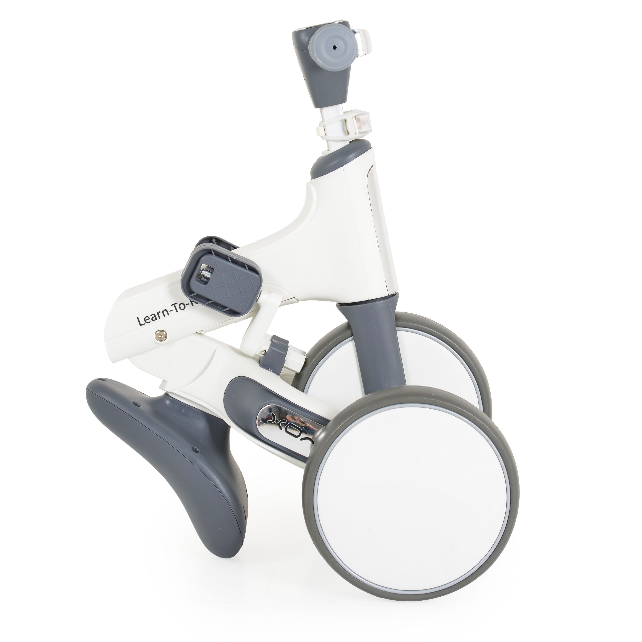 Mini balance bike 2-in-1 suitable for children over 2 years old, with maximum load up to 30kg. Lightweight plastic construction that can be folded to make the tricycle more compact for transport and storage. The width of the handlebars is 31cm with soft, non-slip rubber grips and a limited turning radius. Mode 1 is a balance bike. The two wide wheels positioned at the rear provide a stable base for the child. Each wheel is EVA foam with size 200*40mm. Mode 2 is a tricycle with pedals that can be easily attached and detached to the front hweel. There is a holder for the pedals under the seat when not in use. The bike features a front light with a silicone holder and various lighting modes.