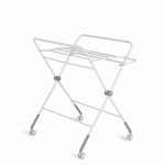 The Kaskada multi-functional changing table by Moni is suitable for newborns from 0+ months, with a maximum weight capacity of 15 kg. It features adjustable height in 5 positions, a foldable design, a 2-point safety belt, and a waterproof changing pad. The table is equipped with a storage organizer, a lower shelf, a removable toy arch with soft toys, and can also be used as a clothes drying rack. It includes 4 wheels with stoppers for easy mobility and stability.