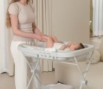 The Croco multifunctional changing table is suitable for diaper changes, baby massage, and dressing, featuring a 5-position adjustable height for parent comfort. It is equipped with a reliable locking mechanism that securely attaches the changing surface to the frame, preventing any unwanted movement during use. The table includes a soft mat with a measurement scale, a 2-point safety harness, a toy arch with 3 soft toys, compartments for hygiene essentials, and a storage shelf. Its foldable design with 4 wheels and brakes allows for easy mobility and compact storage. Made from high-quality, safe materials, it can also be used as a drying rack. Suitable for babies from 0 to 12 months, with a maximum weight of 15 kg.