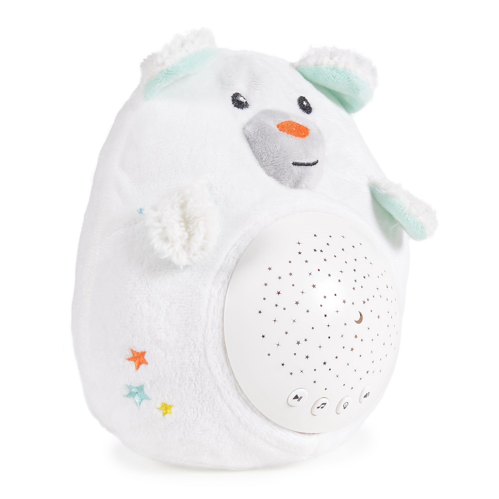 The Starry Sky Night Light and Projector creates a soothing atmosphere by projecting stars in various colors, with the option to fix a preferred hue. It features 10 gentle melodies and nature sounds, along with white noise to help calm and lull babies to sleep faster. The volume is adjustable with two levels, and the detachable projector can be used separately. Designed to stimulate sensory development, it helps little ones recognize shapes, colors, and sounds. The soft and safe plush toy is perfect for cuddling and is suitable for hand washing. Operates with 3 x 1.5V AA batteries (not included).
