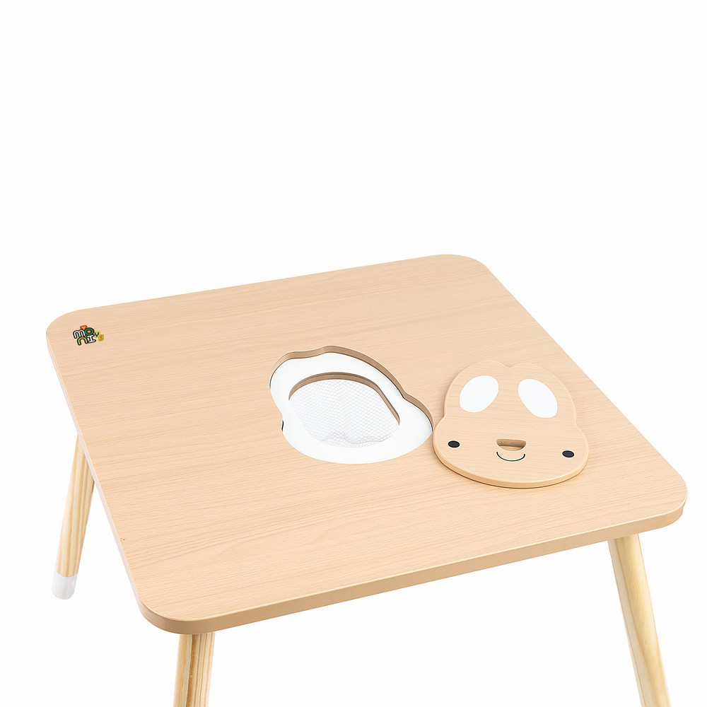 A wooden children`s furniture set consisting of a table and two chairs with a charming bunny design, suitable for children aged 3 and up. The table features a convenient central storage compartment, making it practical for play, learning, drawing, or mealtime. The set has a sturdy construction and is made from MDF and natural pine wood. Its compact size makes it ideal for any child`s room or play corner, combining functionality and style in one practical solution. Table dimensions: 60/60/48; Chair dimensions: 32/30/61
