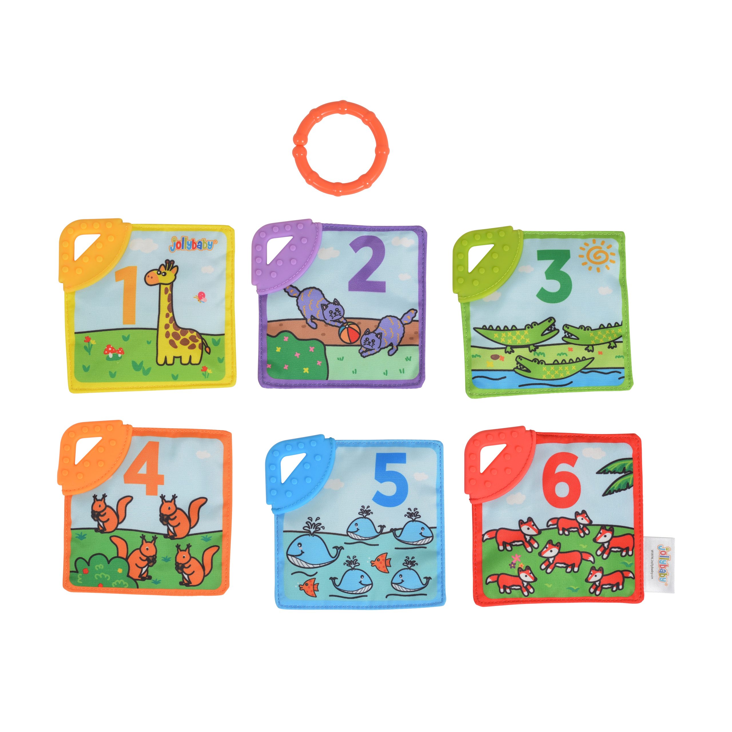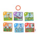 Discover the animals and learn about numbers with the soft book full of colorful pictures! It consists of six double-sided fabric pages, each with a practical teether in the corner that will provide teething wear. Rustling elements and pleasant-to-surround pictures will interest your baby, marking his senses and positively influencing his development. The individual pages are connected with a ring that can be fixed in the chosen place. When the child grows up, he will start learning the numbers, animals and shapes in a fun way for him. The product is intended for children from birth.