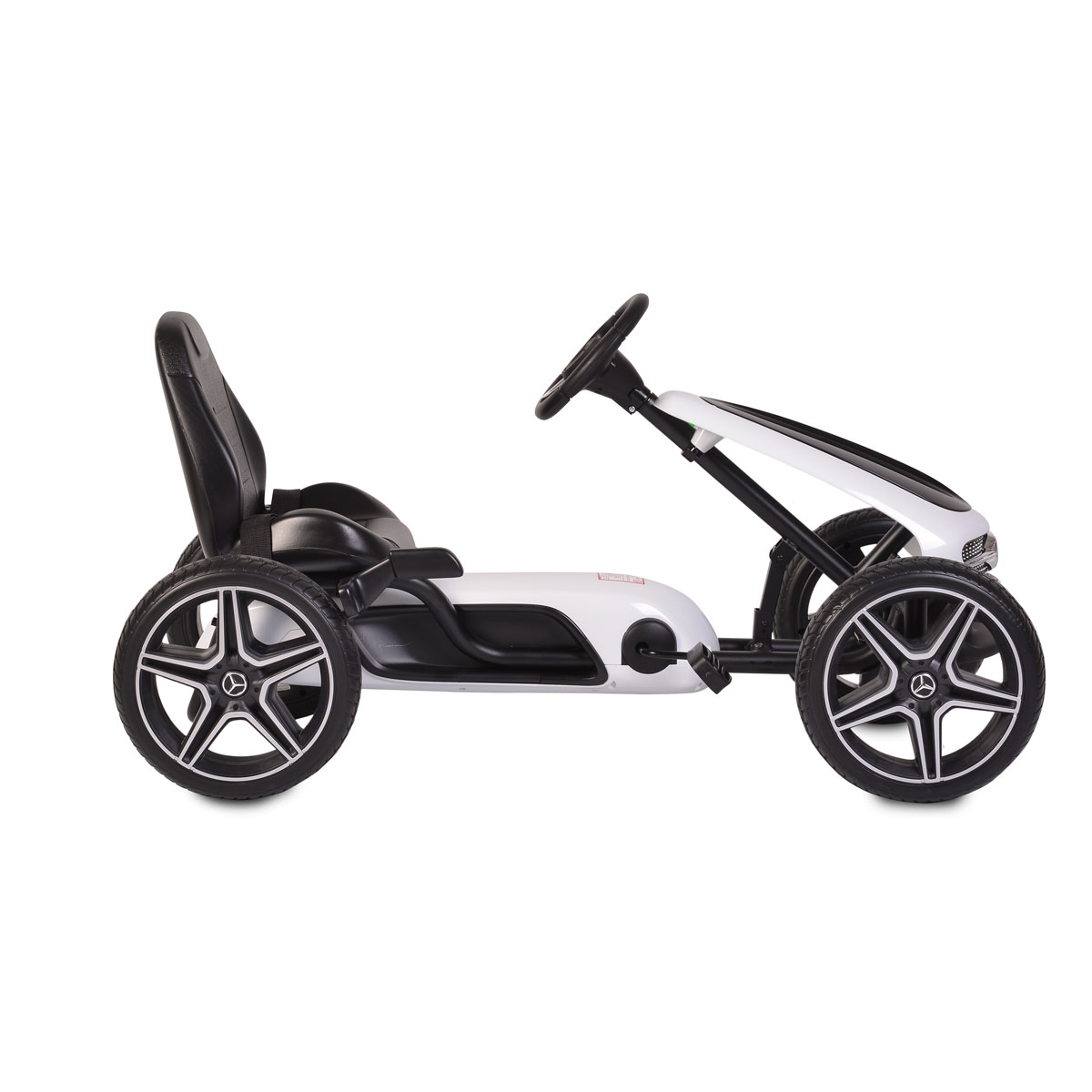 For children above 36 months with maximum weight of up to 30 kg. With soft synthetic EVA wheels. Buttons for music and horn sound. The car can be moved forward and backwards; can be stopped using the manual brake, situated above the right rear wheel. With license from DAIMLER AG (MERCEDES-BENZ). Size of the product: 111.5 x 57 x 61 cm. Size of packing: 110 x 57.5 x 29 cm.