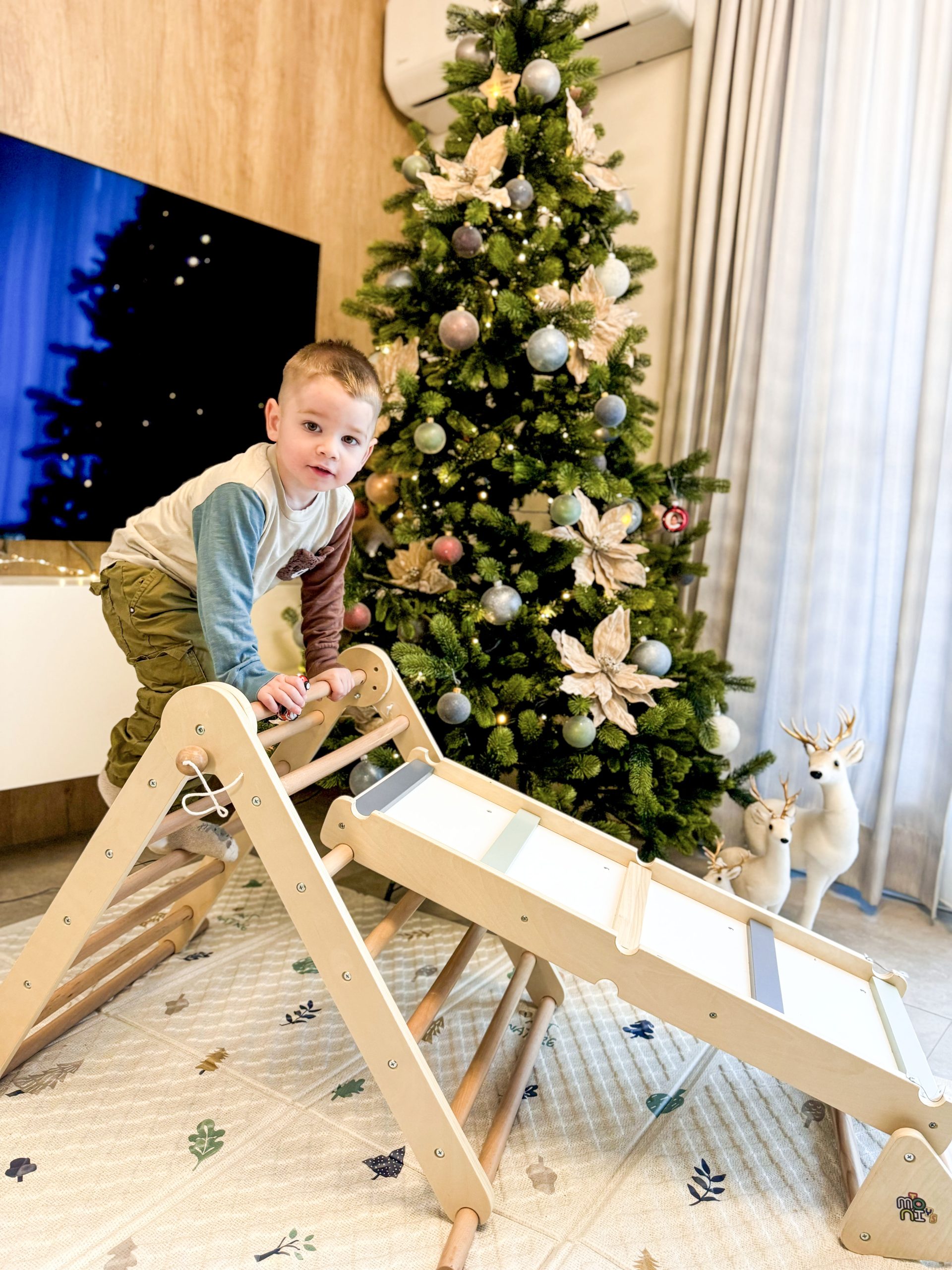 Multifunctional wooden climbing toy. Pickler`s triangle, climbing ramp, balance board. Various adjustment positions, folding for compact storage. Two-sided ramp.