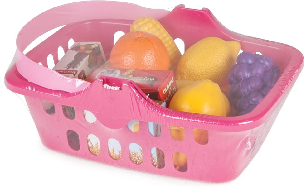 Practical shopping basket with removable handle providing greater wearing comfort, comfortable and ergonomic design. The set includes five different types of fruits and vegetables, as well as two cardboard boxes imitating food. Suitable for role-playing games. Made of high quality paints and materials safe for your child`s health. 24 m +