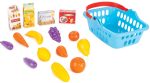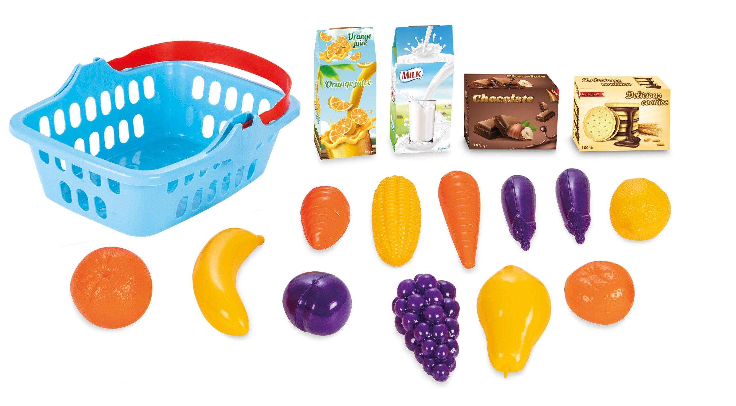 Practical shopping basket with removable handle providing greater wearing comfort, comfortable and ergonomic design. The set includes five different types of fruits and vegetables, as well as two cardboard boxes imitating food. Suitable for role-playing games. Made of high quality paints and materials safe for your child`s health. 24 m +