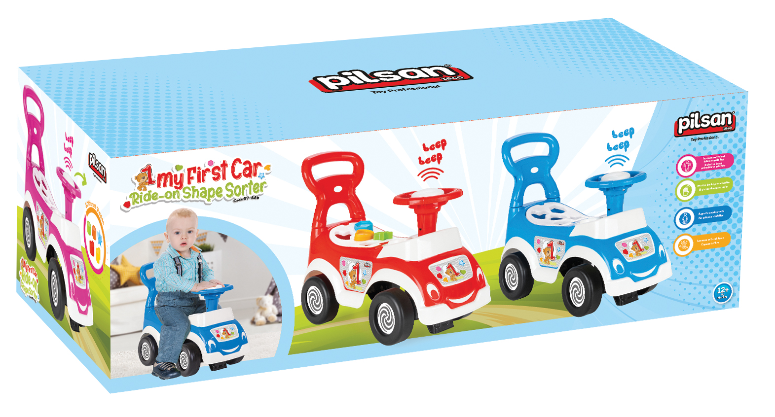 Ride on car suitable for child 12 months older up to 20 kgs, Horn on the handlebar and storage under the seat which is sorter shape and includes 5 shapes