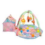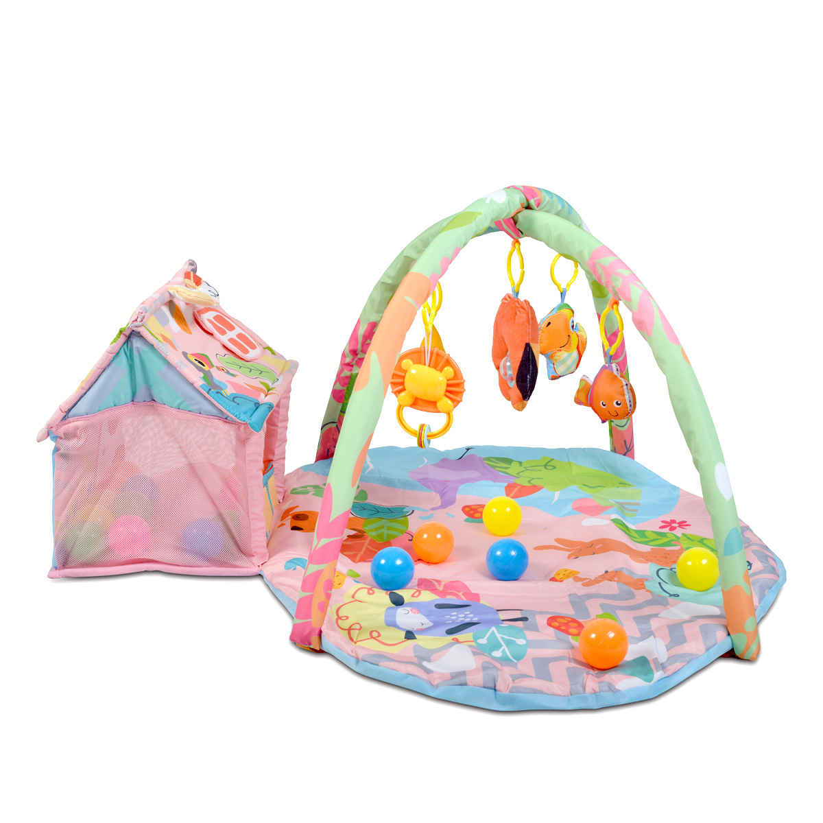 The product is intended for children above 0 months of age. It is an activity play gym with 3 playing positions – on the back, on the tummy and in sitting position with included in the set 30 balls, several soft toys and detachable toy arches. The activity play gym is made of non – toxic materials, safe for the children health. It is with compartment for the balls and function for conversion part of the product into house. This product stimulates the child`s intellect, the motorics of the hands and feet, the recognition of the various shapes and colors. Material: 100% Polyester, PP.