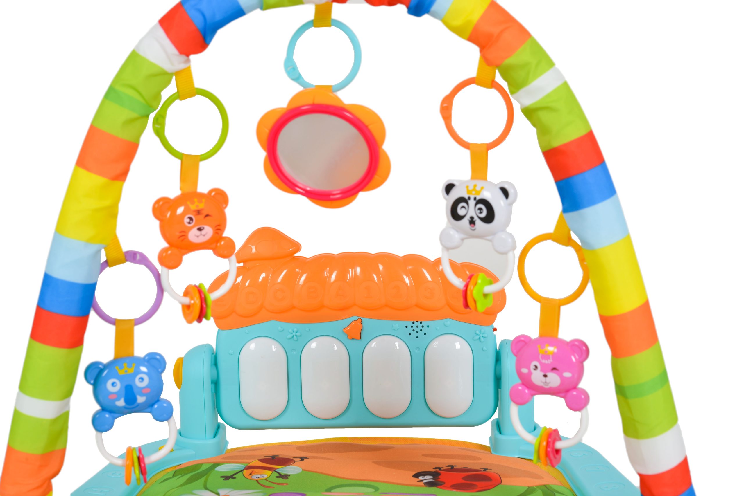 The product is intended for children above 6 months of age. It is an activity play gym with 3 playing positions – on the back, on the tummy and in sitting position. In the set are included several toys, which can be hanged on the toy bars, and a music toy piano. The piano can be used separately and is with various melodies. This product stimulates the child`s intellect, the motorics of the hands and feet, the recognition of the various shapes and colors. The activity play gym is made of non – toxic materials, safe for the children health. Material: 100% Polyester, PP.