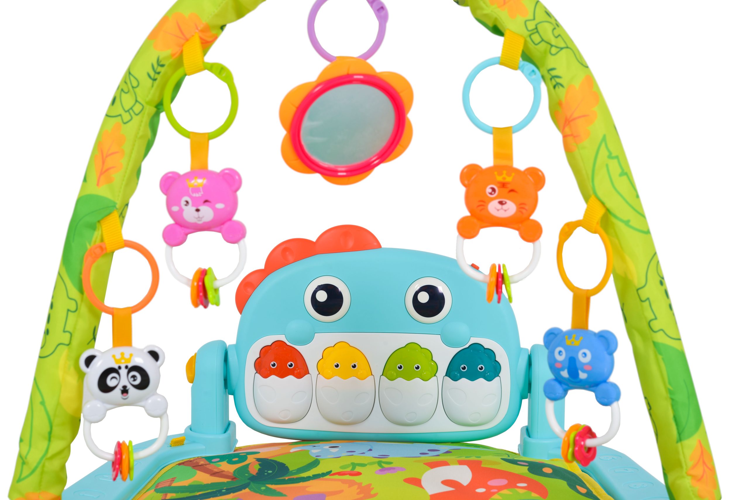 The product is intended for children above 6 months of age. It is an activity play gym with 3 playing positions – on the back, on the tummy and in sitting position. In the set are included several toys, which can be hanged on the toy bars, and a music toy piano. The piano can be used separately and is with various melodies. This product stimulates the child`s intellect, the motorics of the hands and feet, the recognition of the various shapes and colors. The activity play gym is made of non – toxic materials, safe for the children health. Material: 100% Polyester, PP.
