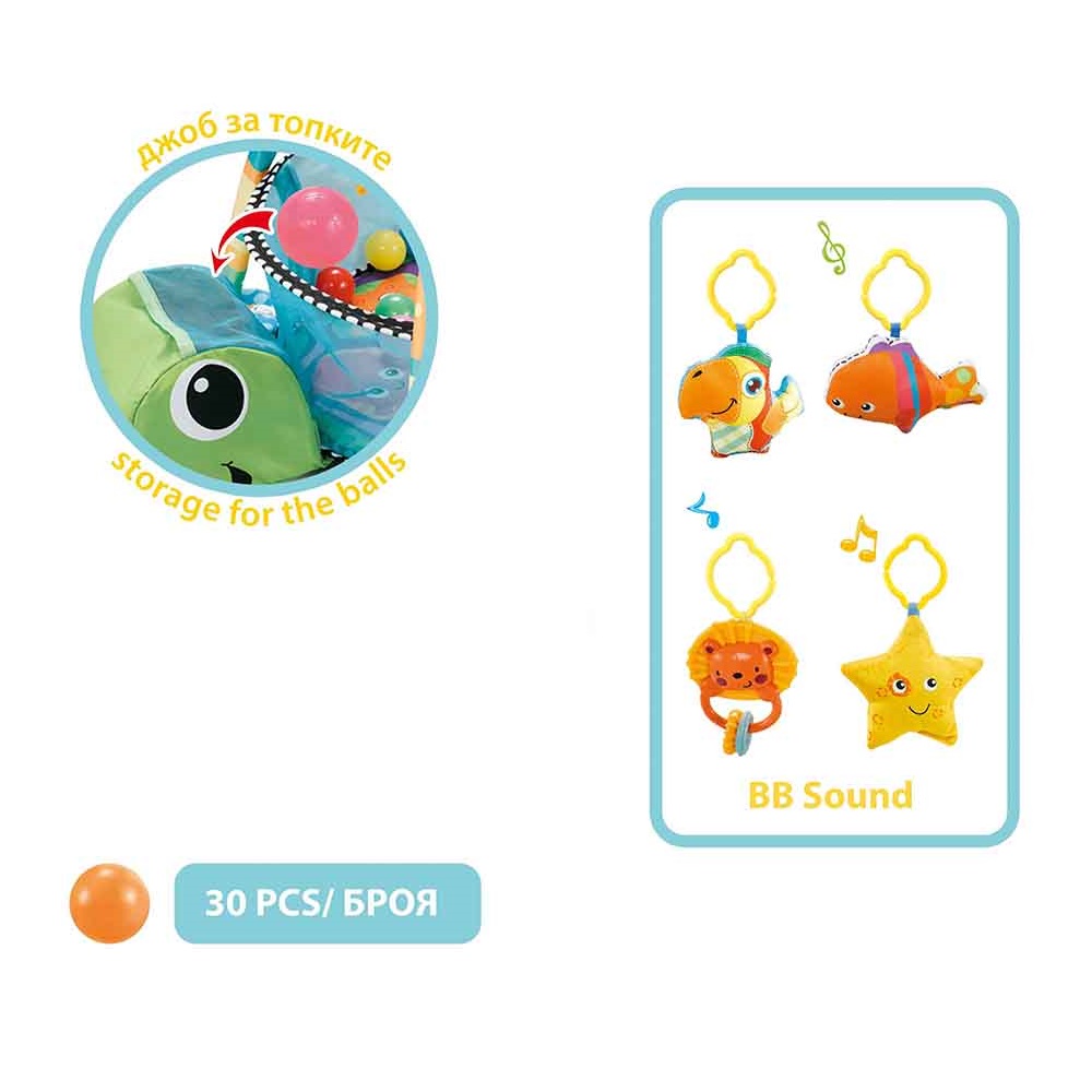 Intended for children above 0 months of age. With 3 playing positions – on the back, in sitting position and playing in the pit, transforming into playing pit with included in the set 30 balls, several hanging soft toys and detachable toy arches. With compartment for the balls and mesh sides around the baby, which can be used for the function “play pit“. This product stimulates the child`s intellect, the motorics of the hands and feet, the recognition of the various shapes and colors.