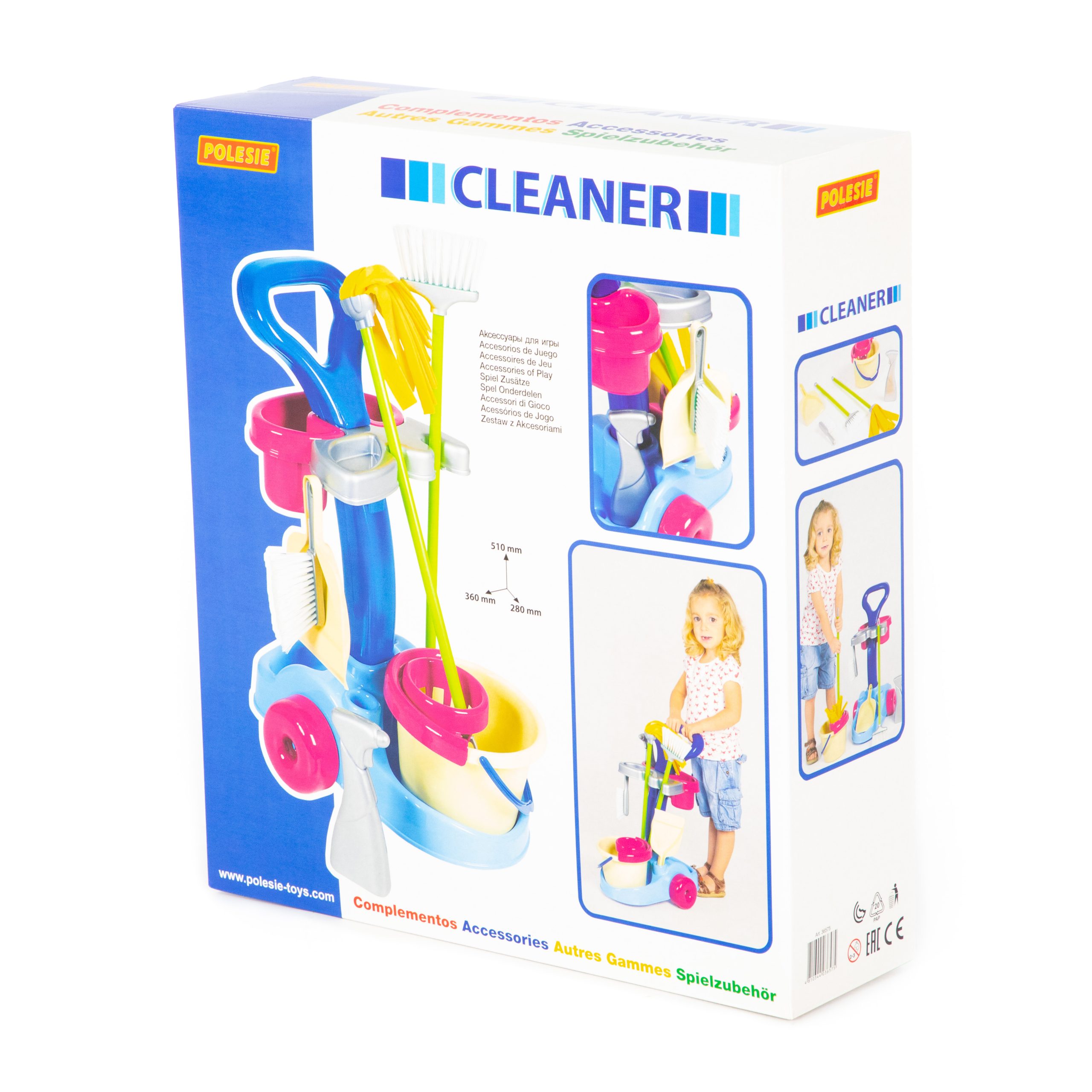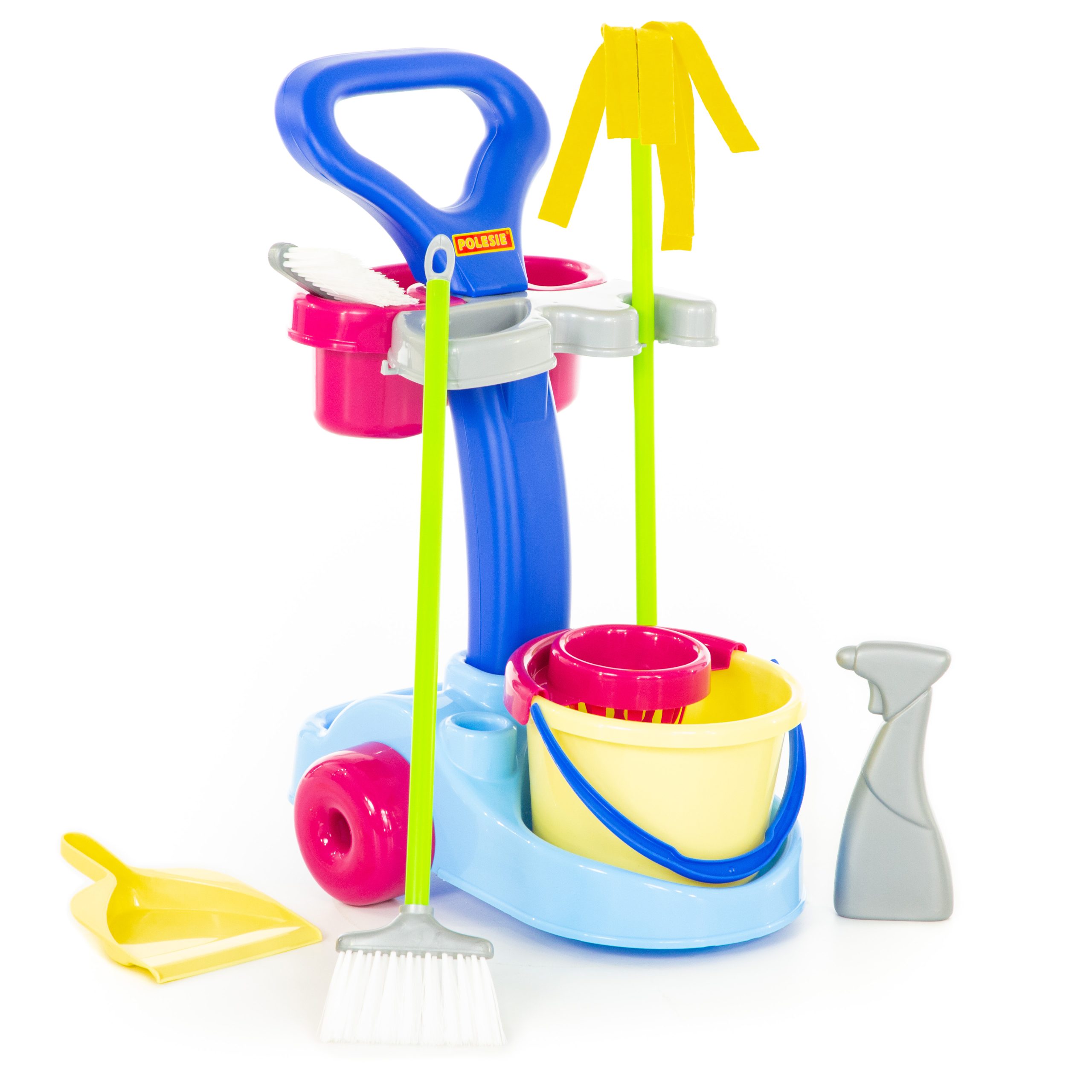 Children`s play set will be a useful gift for any child. With the help of it, your baby will get used to cleanliness and learn how to clean up in his room. It includes a variety of tools for cleaning the apartment, including a toy bucket, a mop and even a play bottle from the field of household chemicals (empty). All parts of the kit are located on a convenient trolley. Cart height – 51 cm