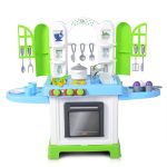 This is a gaming set that imitates a real kitchen with a large worktop. In this case, the design assumes the presence of windows that complement the design and make the game more realistic. The set is equipped with several zones: a cooking zone, including a deep fryer, and a dishwasher zone. On the top panel of the set is a stove with burners, and under it an oven. In addition, the kitchen design provides shelves on which it is convenient to store toy dishes. The game complex “NATALI“ No. 3 complements: – pan, – frying pan, – salt shakers (2 pcs.), – saucers (2 pcs.), – knives (2 pcs.), – forks (2 pcs.), – spoons (2 pcs.), – saucers (2 pcs.), – kitchen appliances (4 pcs.).
