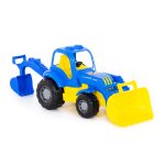 Toy recommended for children from 12 months. The vehicle is equipped with wide and large wheels, which makes it easy to move on uneven surfaces. The tractor has a wide bucket of the loader mounted on a movable arm – great fun guaranteed. Excavator function. The rear movable arm with the second “bucket“ and the function of the excavator will make even more fun. With the arm extended, the excavator`s length increases to almost 40 cm.