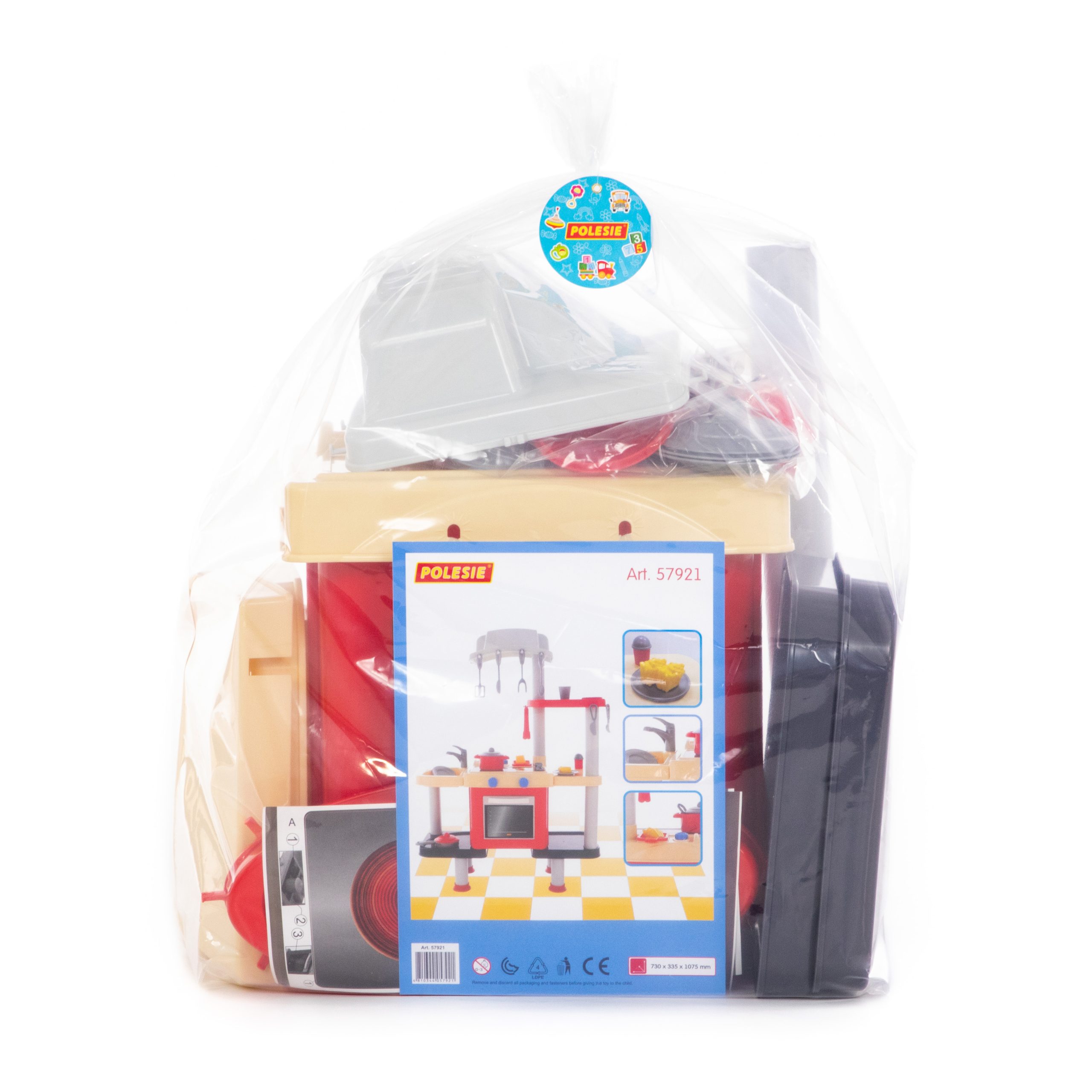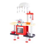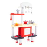 The stove is equipped with an oven with door opening, sink with a tap on one, a counter on the other side, in the middle there is an imitation of two induction hobs. The hood is also a shelf for storing essential kitchen accessories. The set also includes: cutlery, dishes, pots with lids, mugs and groceries.