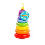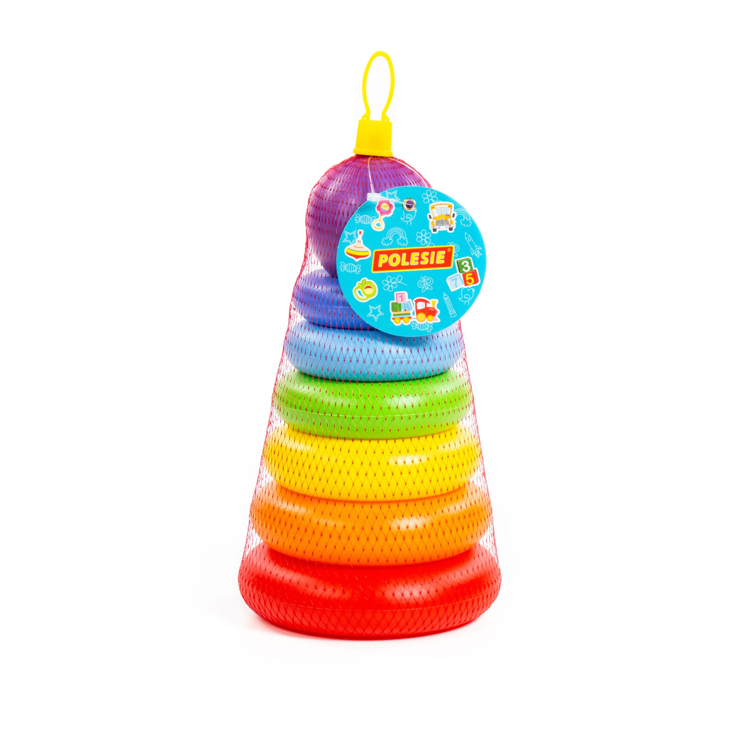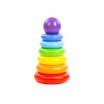 Toddler sets up colorful circles on top of each other and learns to organize items by size. Vivid colors and interesting shapes stimulate the senses and provide joyful, educational fun!