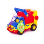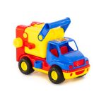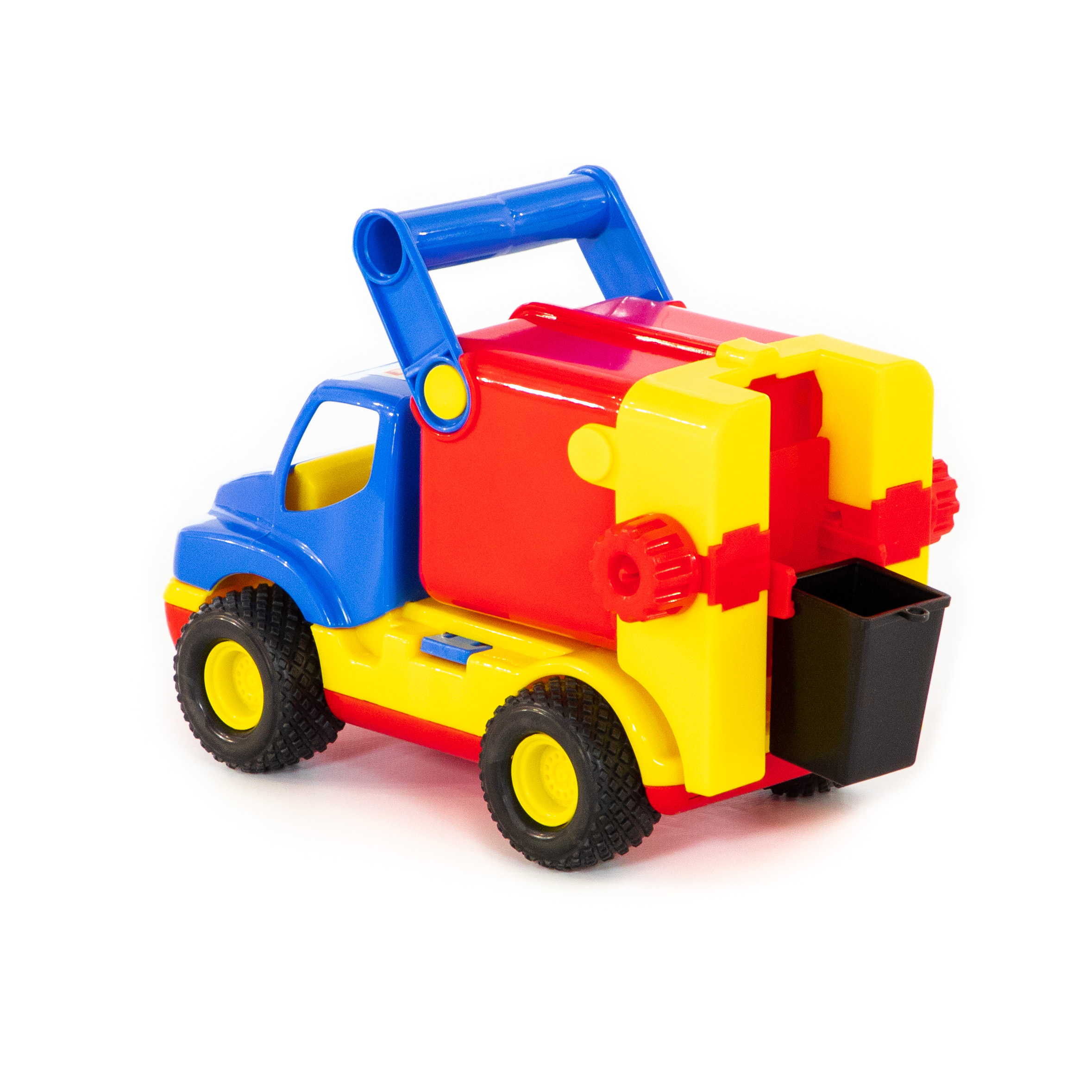 Garbage truck with rubber wheels. Mechanical control of the container. Rounded shapes. Suitable for children over 12 months of age.