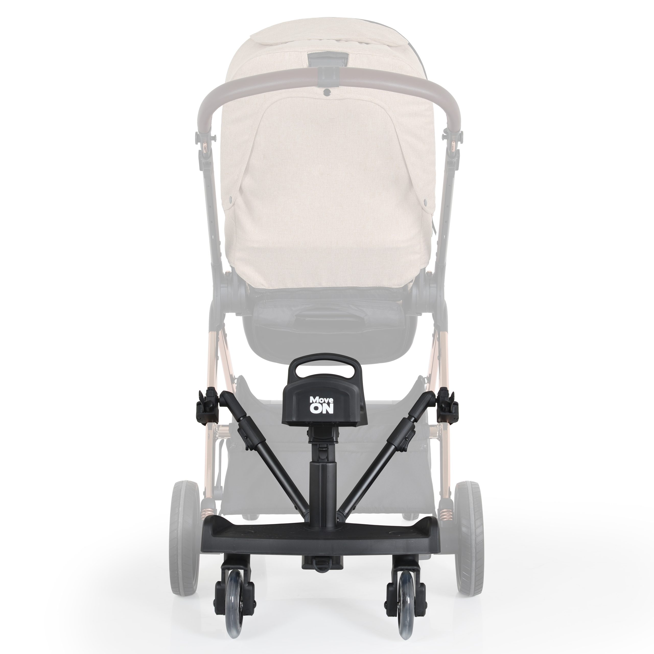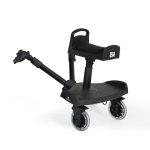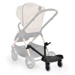 Universal buggy board with a seat for second child, it`s adaptable to almost all types of strollers. Swivel wheels with easy release function. Tubes: Aluminium 2 pcs of 4.5“ Skating wheels Plastic: PP Telescopic adapters for universal mounting. Platform with seat, which rotates by 90 degrees and has 3 height positions. Quick and easy attachment of the board. Compact folding. Dimensions“58x36x56cm. The product is suitable for children over 15 months of age and maximum weight 20kg.