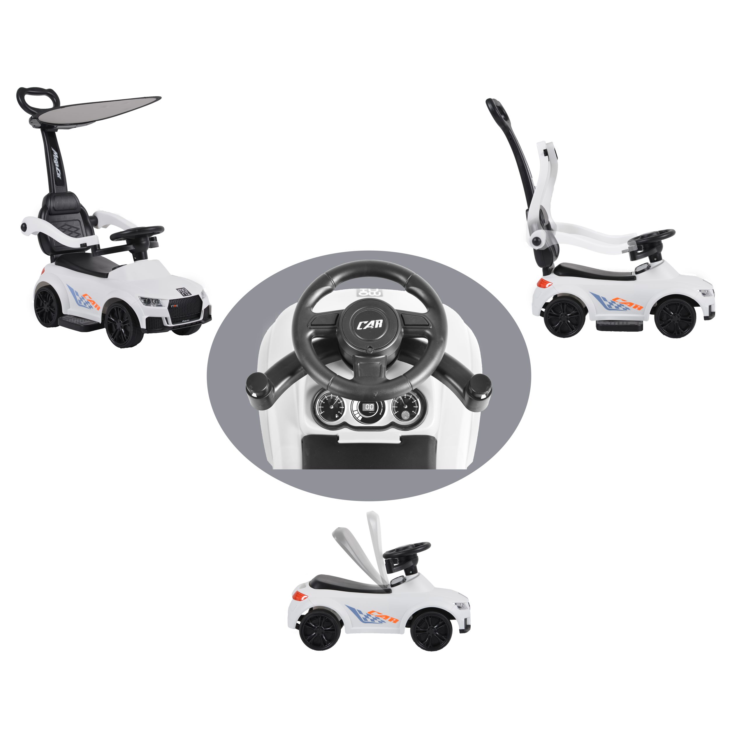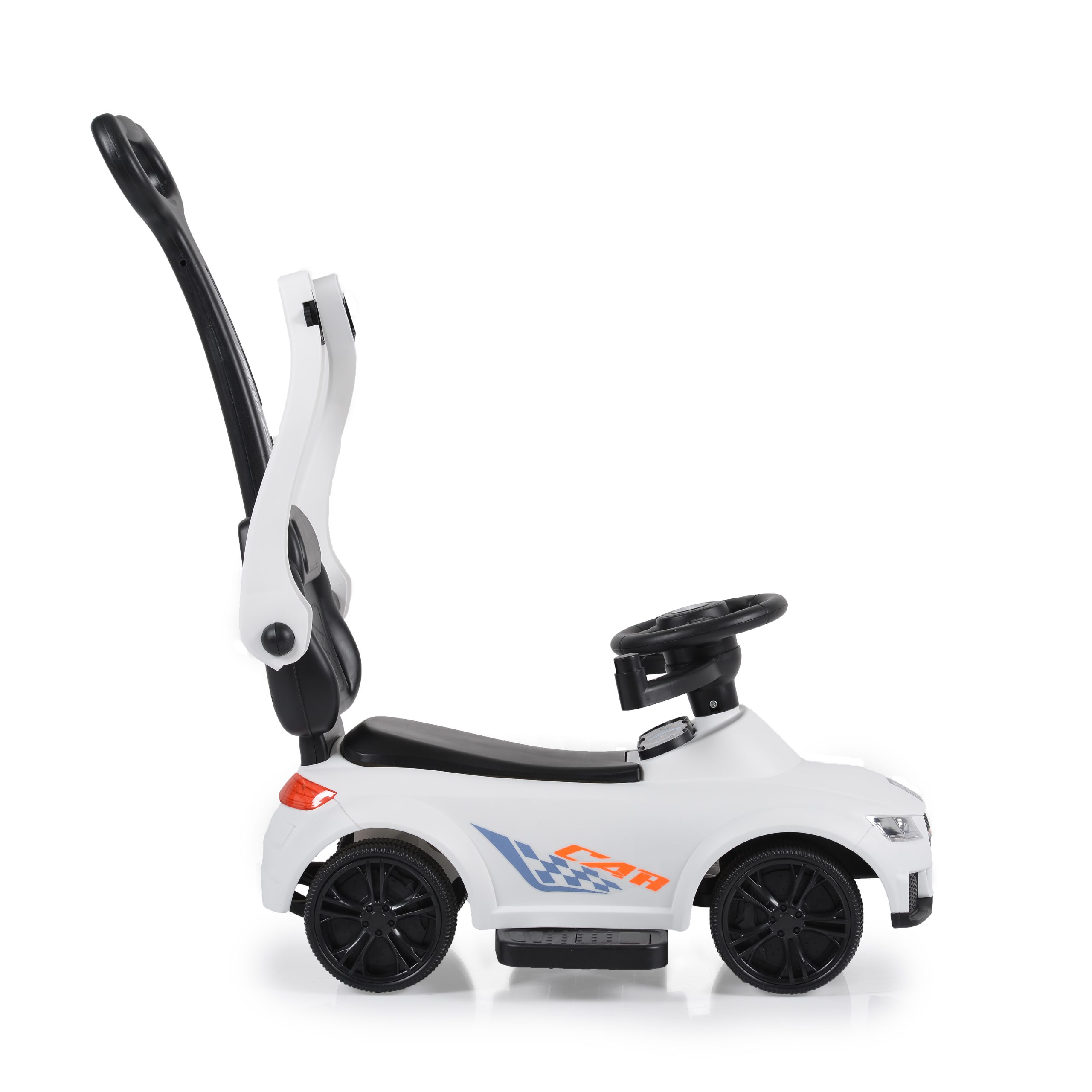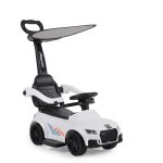The product is intended for children aged above 36 months (3 years of age), weighing up to 23 kg. With a design, which contributes to the development of the motor skills and balance of the child. With removable parent control handle and canopy, detachable front safety board and foot rest for smaller children. Buttons for various fun melodies on the steering wheel. The music functions are activated using 3 x AA 1.5V batteries (not included).