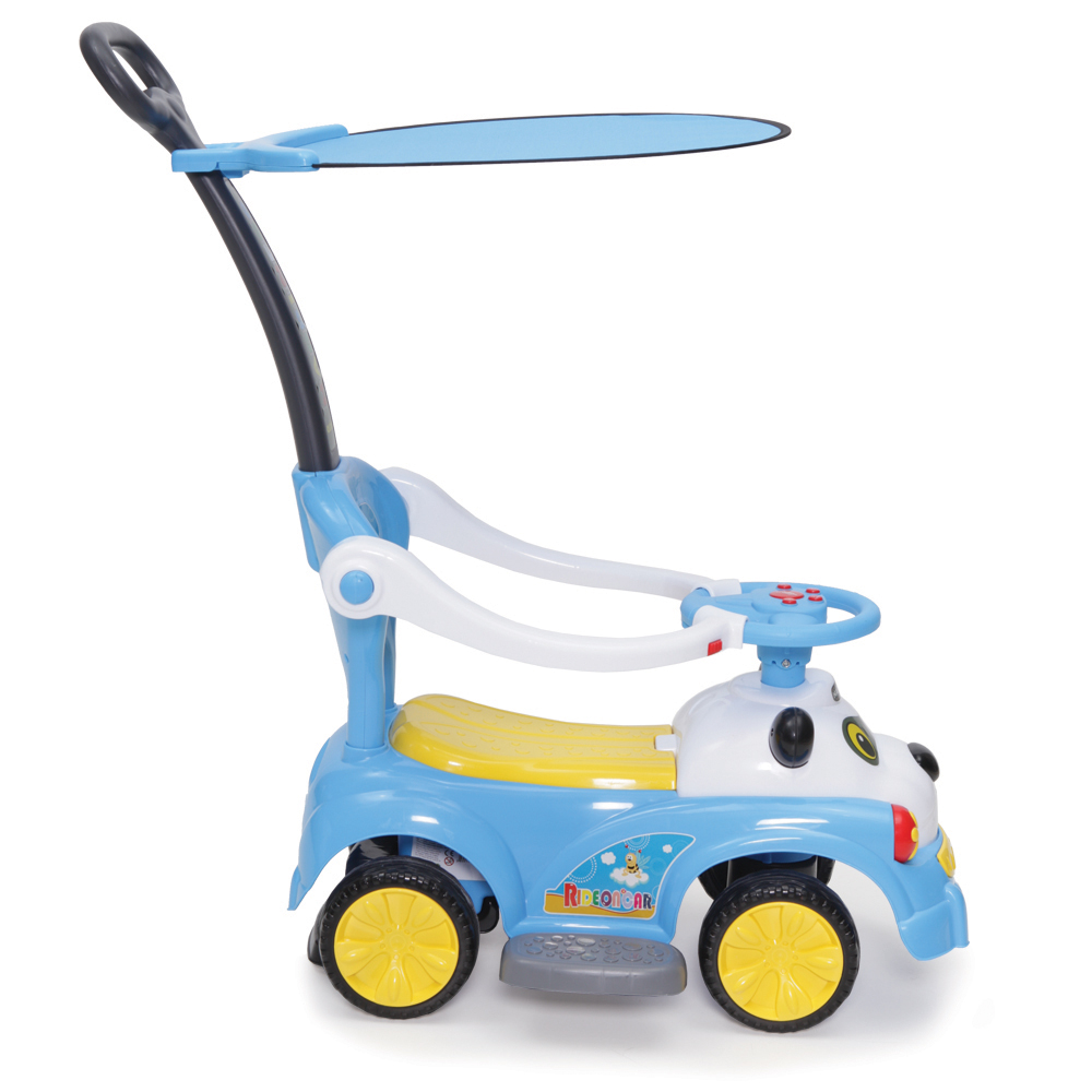 The product is intended for children aged between 18 and 72 months, weighing up to 25 kg. The children ride – on car is with a design, which contributes to the development of the motor skills and balance of the child. It is with comfortable seat and backrest, canopy, parent pushbar, armrest and footrest. Buttons for various fun melodies are situated on the steering wheel. The music functions are activated using 2 x AA 1.5V batteries (not included).