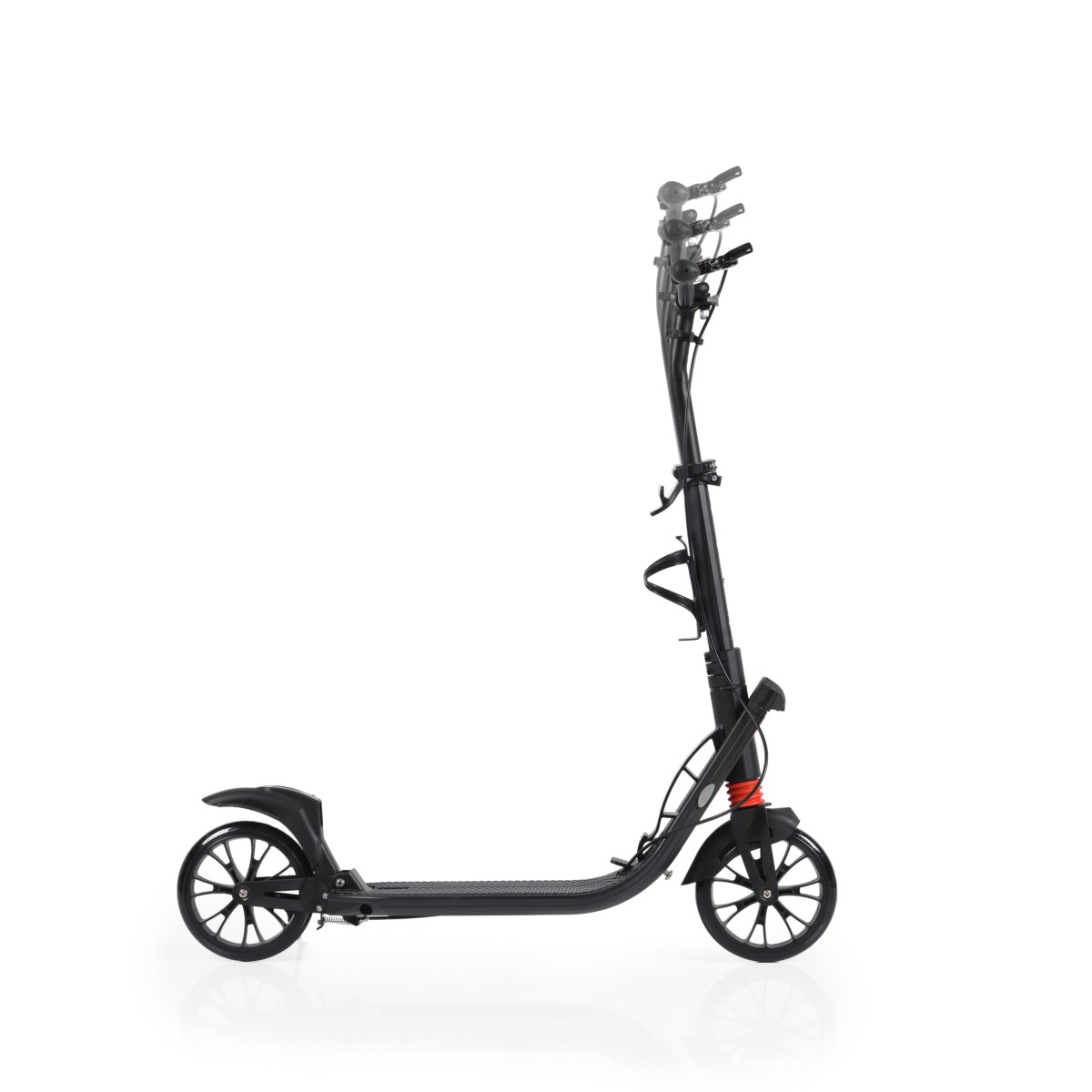 Easy folding adult alloy scooter; Front and rear suspension system; Hand rear brake and rear foot brake; Foot deck size 470-160mm with rubber anti-slip cover; Side stand; PU wheels size 200*30mm with ABEC-9 bearings; Adjustable bar from 94 up to 104cm, handlebar width 52cm with ergonomic 12cm grips; Water bottle cage; Max weight 100kg; Age 8+