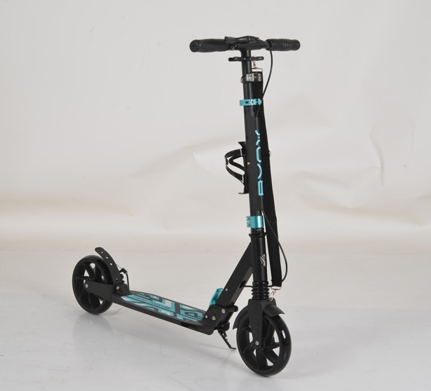 Aluminum kick scooter with rear disk brake ; PU wheels with size 200*40mm ; Dual suspention – front and rear ; Side kickstand ; Max handlebar height 104cm; Max weight 100kgs