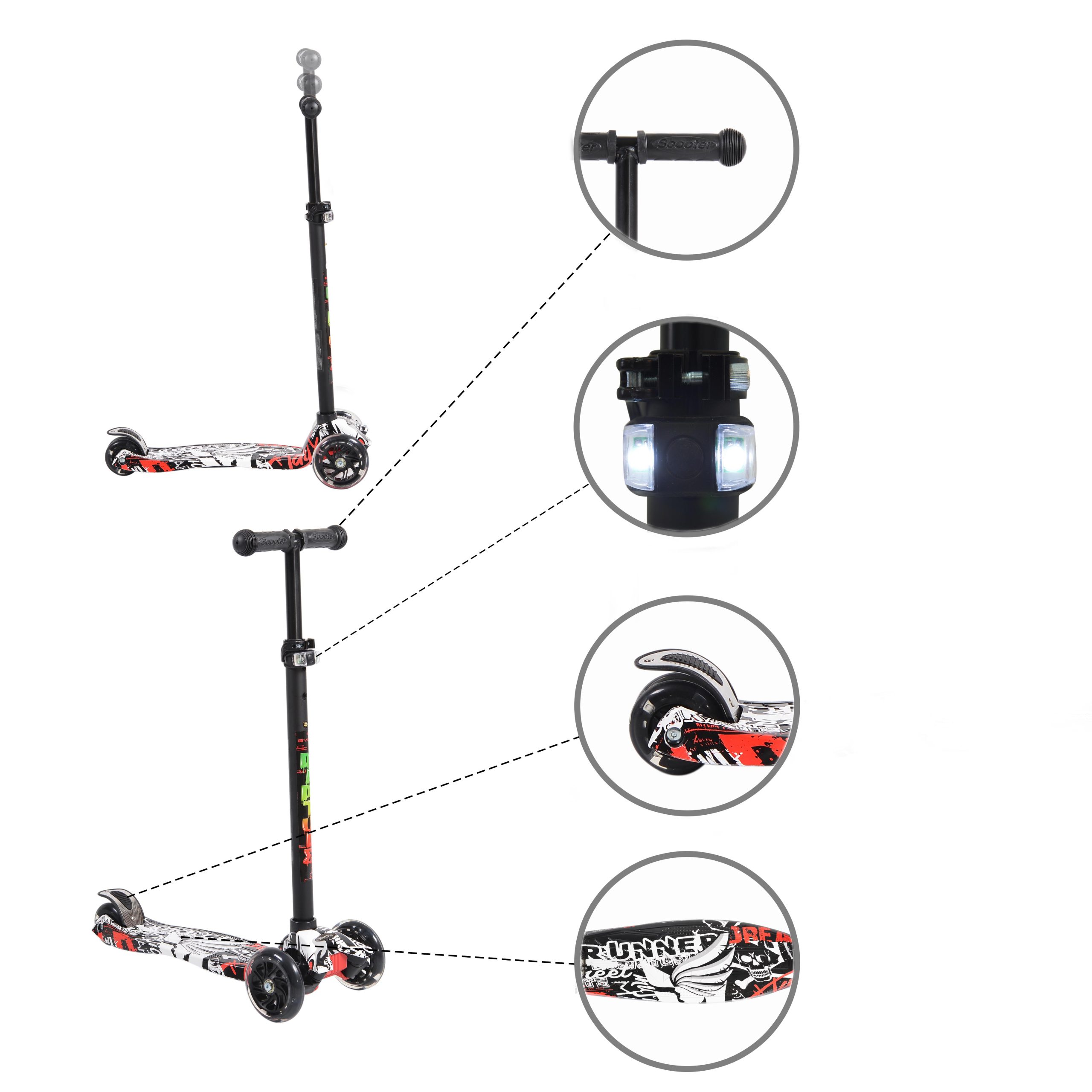 Aluminum scooter with water printed PP deck; PU LED wheels size : front -120*30mm; two rear 80*30mm; Max handlebar height 80.50cm; Max load 40 kg
