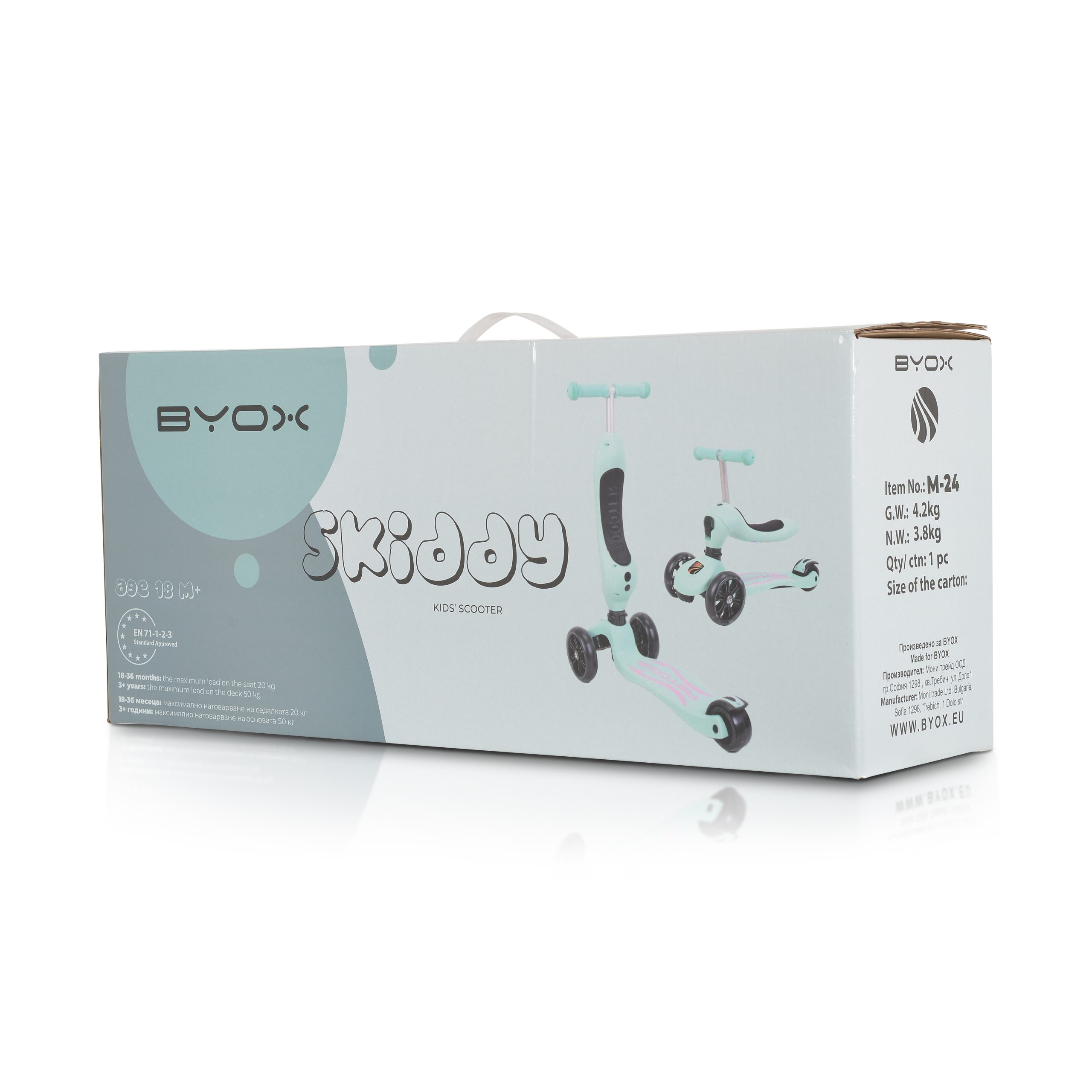 Skiddy is a transforming scooter that can grow with your child. It is intended for children over 2 years of age and weighing up to 50 kg. The 1st option is with a seat while the child is still small. The seat supports children up to 20 kg. The 2nd option, when the child is a little older, the seat turns and transforms into a steering base. In both options the Skiddy has 3 handlebar height positions. There is a brake mechanism at the back of the base that is activated by foot pressure. It is made of high-quality plastic and has all the necessary tests and safety standards.