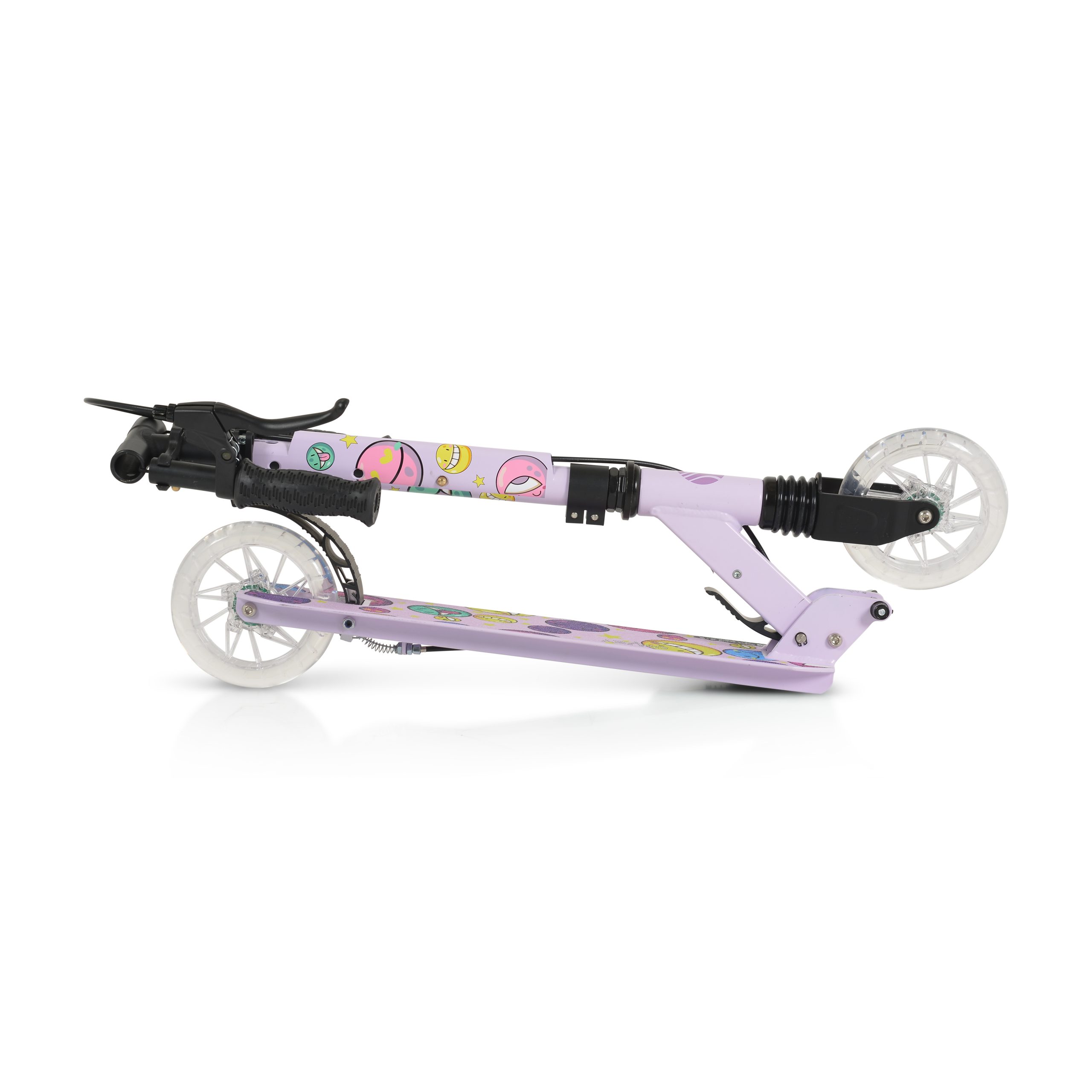 Foldable full aluminum scooter; Front fork suspension; Rear handle brake and rear alloy foot brake; Deck size 500-115mm with sand paper cover and side stand;PU transparent LED wheel size 145*30mm with ABEC-7 bearings; Adjustable height of the T-bar from 75cm up to 89cm with width 40cm and rubber grips 110mm; Max weight up to 100kg; Age 8+