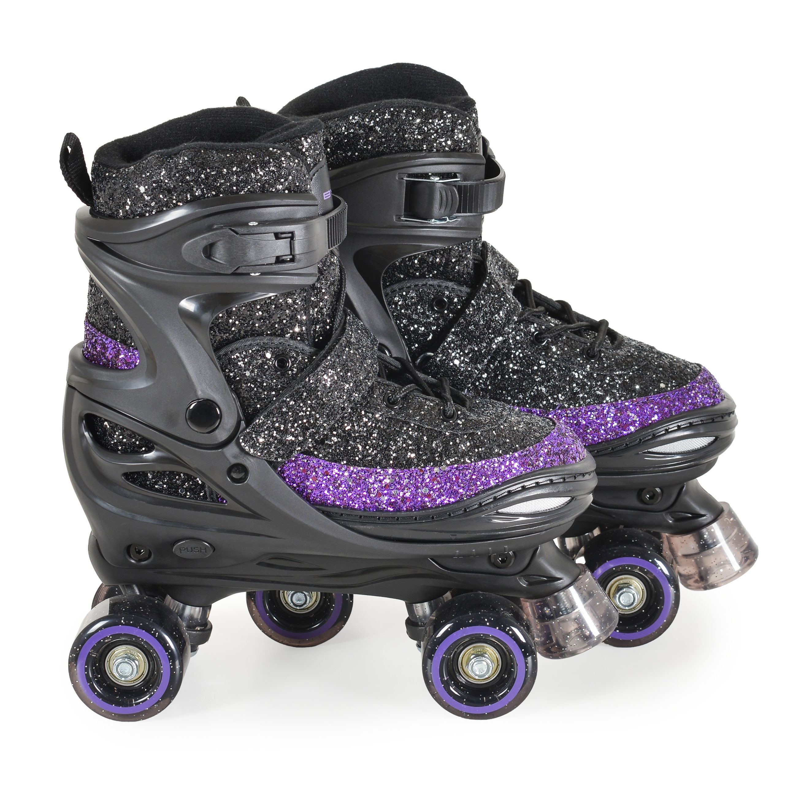 Semi-soft Adjustable inline skate adjustable for 4 sizes by push button one double safety buckles and one powerstrap with full lace Upper: Glitter mesh, fashion design Lining: breathable velvet with foam padding Closure: Lace+powerstrap+buckle Cuff: impact resistance PP Shell: impact resistance PP Frame: high strength PP Wheels: good quality 58*32mm PU casted wheels with glitter Bearing:ABEC-5 carbon steel Brake pad: PU with glitter