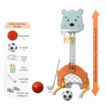 Children`s sports set with music and stories in English. The toy includes: a basketball hoop with adjustable height; a soccer goal; a golf game; a soccer ball; a basketball; 4 throwing rings; a golf stick; a golf ball and 2 suction cups for fixing.