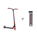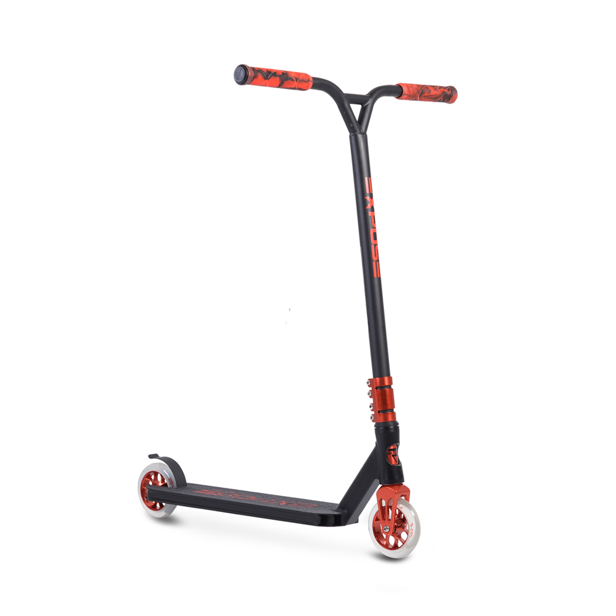 Stunt alloy scooter with HIC system, PU transparent wheels 110mm with alloy core, ABEC-9 bearings; Alloy fork; 4 bolt clamp; Steel handlebar 570mm width with two color grips 160mm and height 850mm; rounded deck with waterproof sandpaper plus one sandpaper as a gift; size of the deck 495mm/ 110mm; for age 10+, max weight up to 100kgs