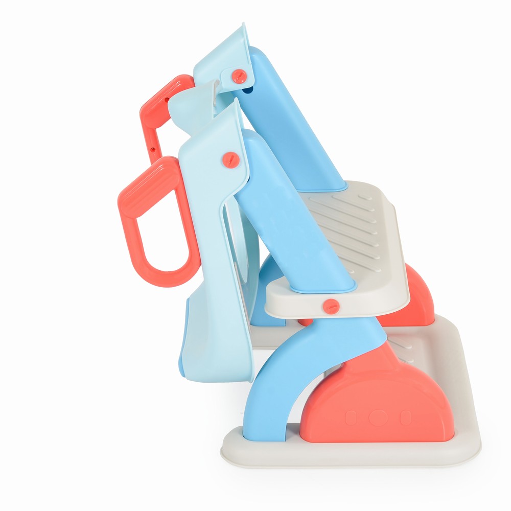 The movable seat facilitates cleaning and ensures better hygiene. Ergonomic handles provide a secure and comfortable grip when getting on and off. The special triangular construction evenly distributes weight and improves stability. Textured, non-slip steps and rubber elements at the base prevent slipping. A snug and stable fit to the toilet bowl base is ensured by non-slip elements, providing extra security. Adjustable height from 38 to 45 cm makes it suitable for different toilet bowls (diameter 37-42 cm). The compact, foldable design allows for easy storage when not in use.Suitable for children aged 18 months and older, with a weight capacity of up to 25 kg.