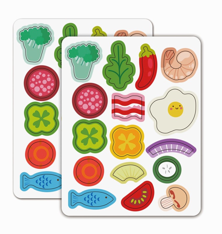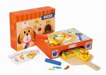 Wooden pizza making kit. The set contains 39 parts, including an oven, pieces of pizza that stick together with Velcro, menus and utensils for cooking and serving. These types of games, apart from being fun, also develop children`s social skills, fine motor skills and imagination. You can have fun together with your child by recreating situations and playing all together.
