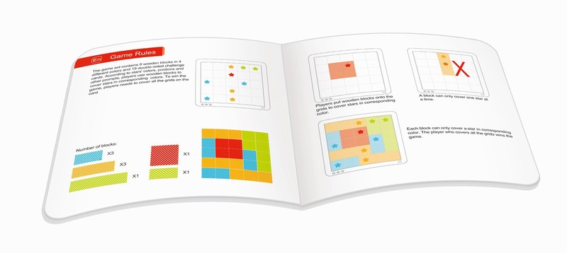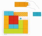 This is a logic game, with different levels of difficulty. It contains pieces that you have to arrange on the field so that each piece has stepped on the star of the corresponding color. Anyone who likes puzzles and brain teasers will love this game. She is interesting and very funny. With it, children will develop their logic and thinking. The set contains cards with the levels that the child must pass and wooden blocks of different colors and number of squares.