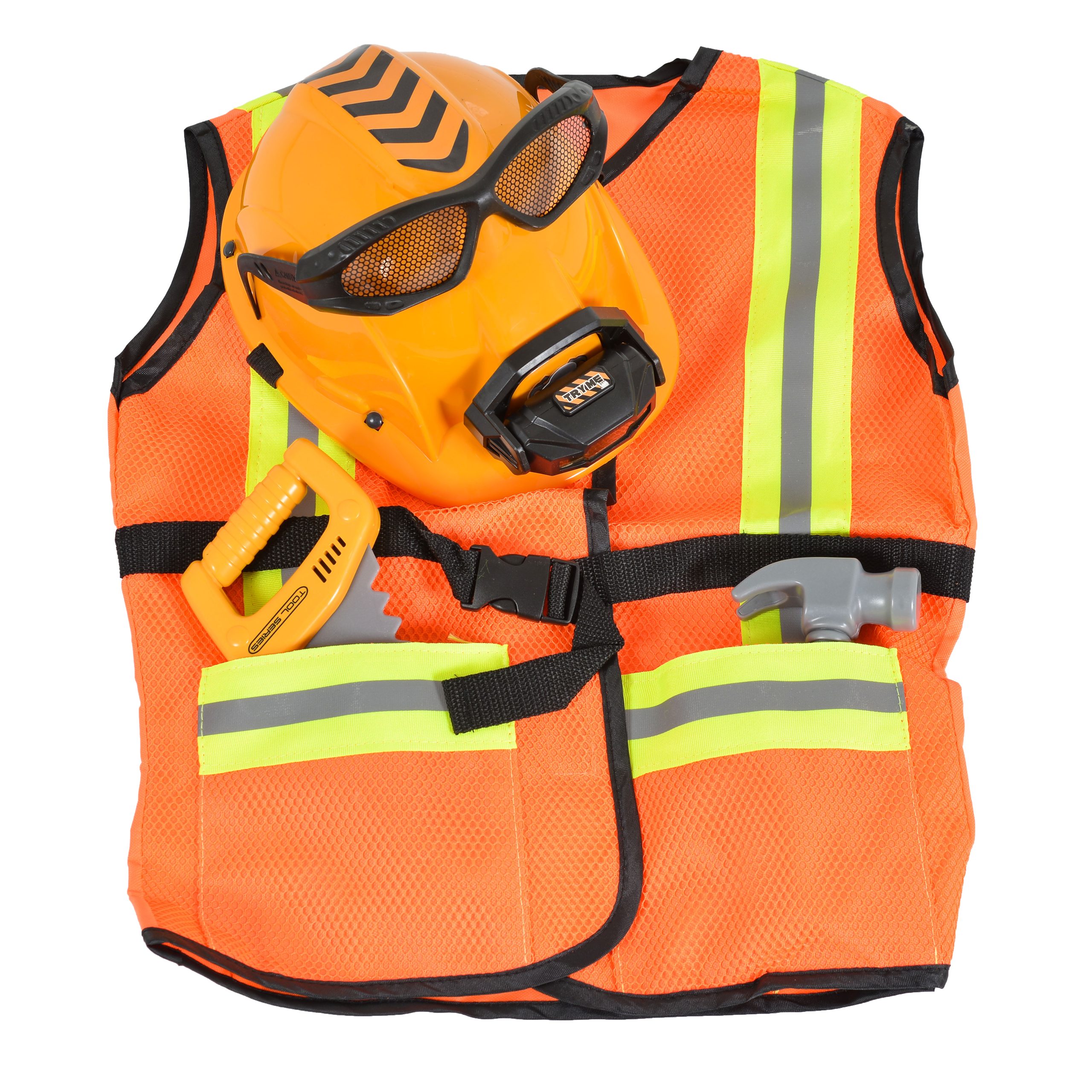 Realistic set with vest, helmet and tools. The helmet lights up and runs on 3 xAG13 batteries.