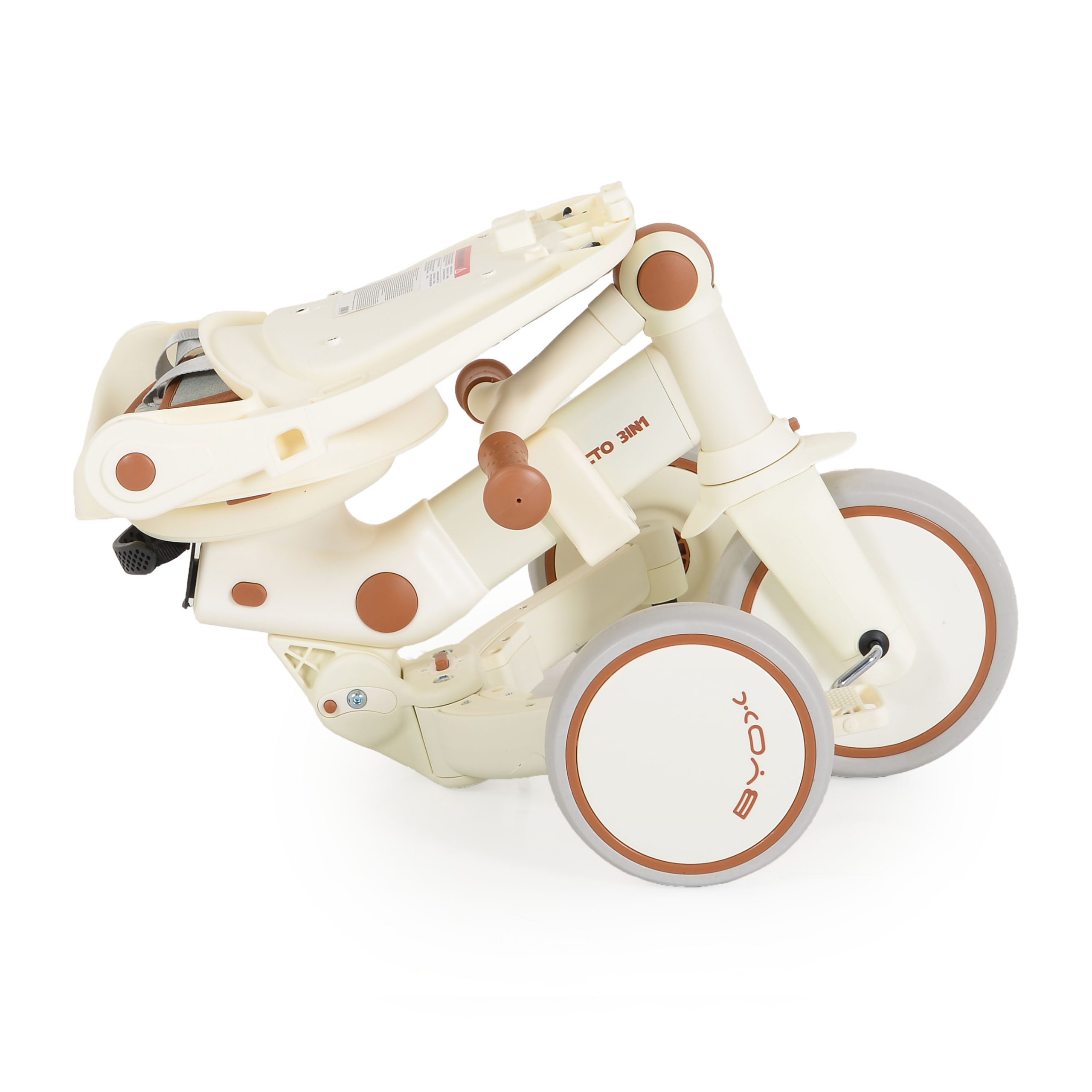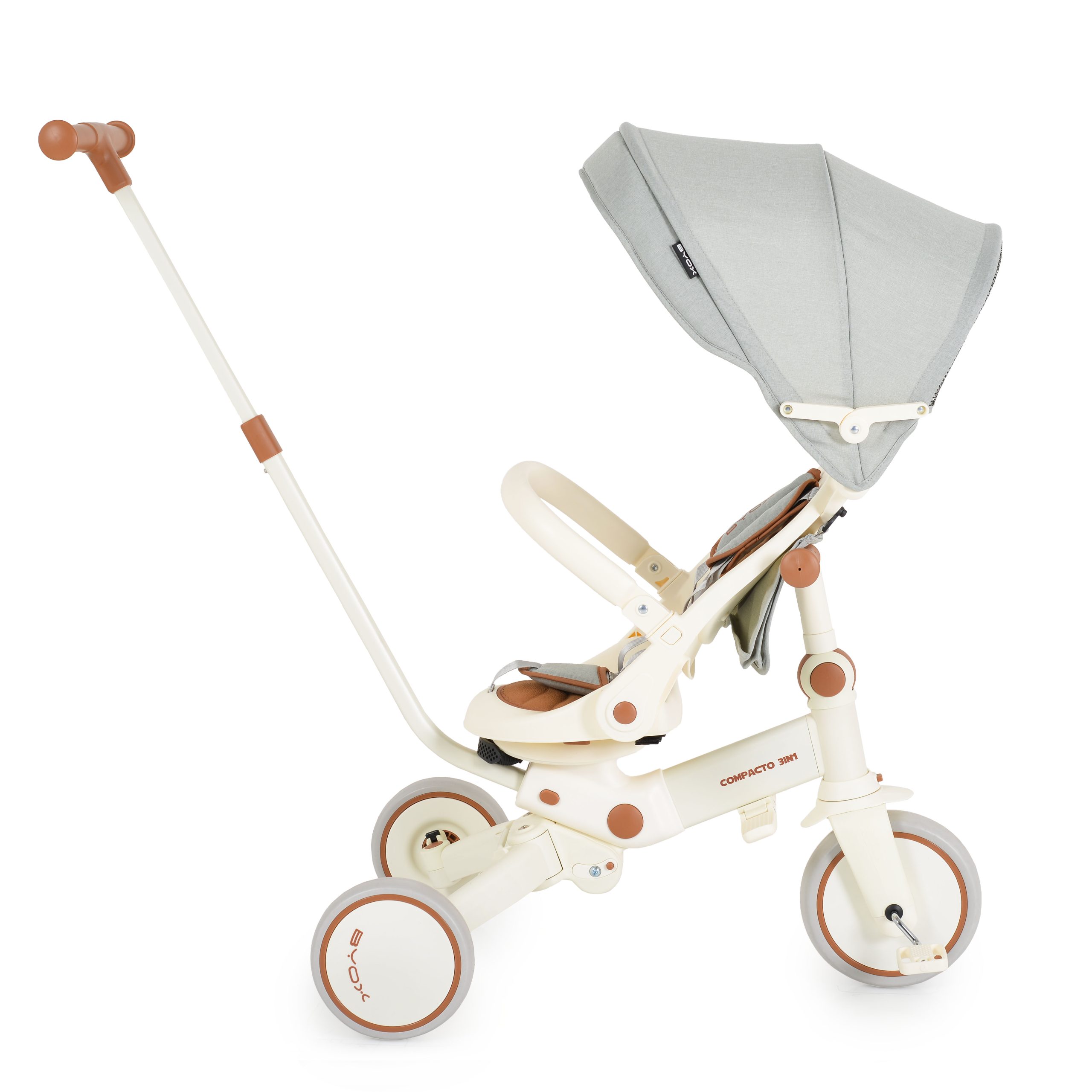 For children from 12 till 72 months of age with maximum weight of up to 25 kg. 3 ways of using: 1. With the parent control handle; 2. Without the parent control handle; 3. As a balance bike. The canopy, part of the seat and the safety bord are detachable. Foldable rear frame. Handle to carry the tricycle when folded. Seat: can be attached forward facing the road or rearward (the child to face the parent). Soft pad on the seat and the backrest, 3 – point safety belt with soft pads. Additional plastic pad for the seat in the function balance bike. The backrest is adjustable: in 2 positions when forward facing; in 4 positions when the child is facing the parent. The safety board is not fixed – can be moved to adjust the folding of the tricycle. Big canopy with 2 sections. The parent control handle – is adjustable to 4 positions of height. Foldable handlebar. Wheels: Front 7 inch and rear 6.5 inch, made of EVA foam and not inflatable. Front wheel is with free wheel function. Foldable footrest for smaller children. 2 rear brakes. Size of the product: Height – 97 cm; Width – 50 cm; Length – 70 cm.