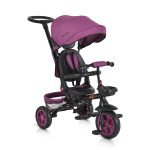 For children from 12 till 60 months of age with maximum weight of up to 25 kg. Can be used without the canopy, parent control handle and safety board. Foldable rear frame. Seat: rotating in 360°; adjustable backrest. Parent pushbar – Adjustable, controling the direction of movement of the front wheel. Wheels – rubber not inflatable. Front wheel with clutch for free wheel function. Detachable safety bar. 3-point seat belts. Two rear brakes. Front and rear toy basket. Bag for accessories.