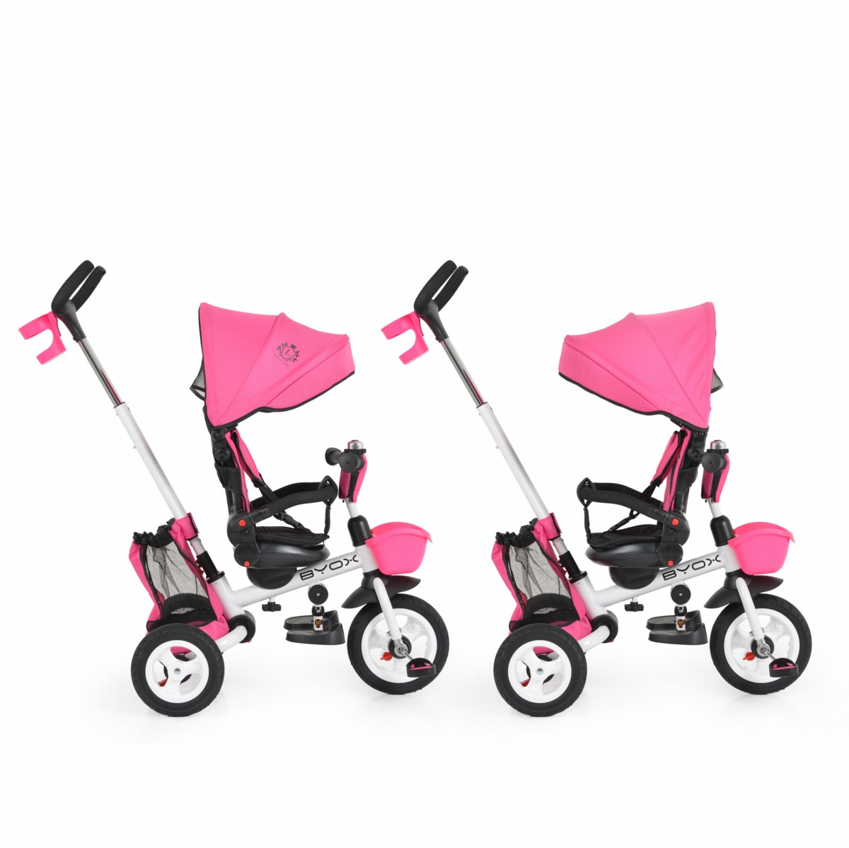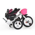 For children above 1 Year and a half of age with maximum weight of up to 25 kg. Can be used without the canopy, parent control handle and safety board. Foldable rear frame. Seat: rotating in 360°; adjustable backrest. Parent pushbar – Adjustable, controlling the direction of movement of the front wheel. Wheels – rubber not inflatable. Front wheel with clutch for free wheel function. Soft safety bar. Removable seat cushion and 5-point seat belts. Two rear brakes. Bell. Cup Holder. Bag and front toy basket.