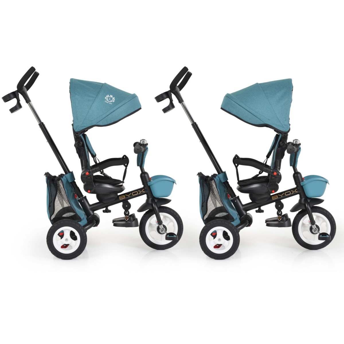 For children above 1 Year and a half of age with maximum weight of up to 25 kg. Can be used without the canopy, parent control handle and safety board. Foldable rear frame. Seat: rotating in 360°; adjustable backrest. Parent pushbar – Adjustable, controlling the direction of movement of the front wheel. Wheels – rubber not inflatable. Front wheel with clutch for free wheel function. Soft safety bar. Removable seat cushion and 5-point seat belts. Two rear brakes. Bell. Cup Holder. Bag and front toy basket.
