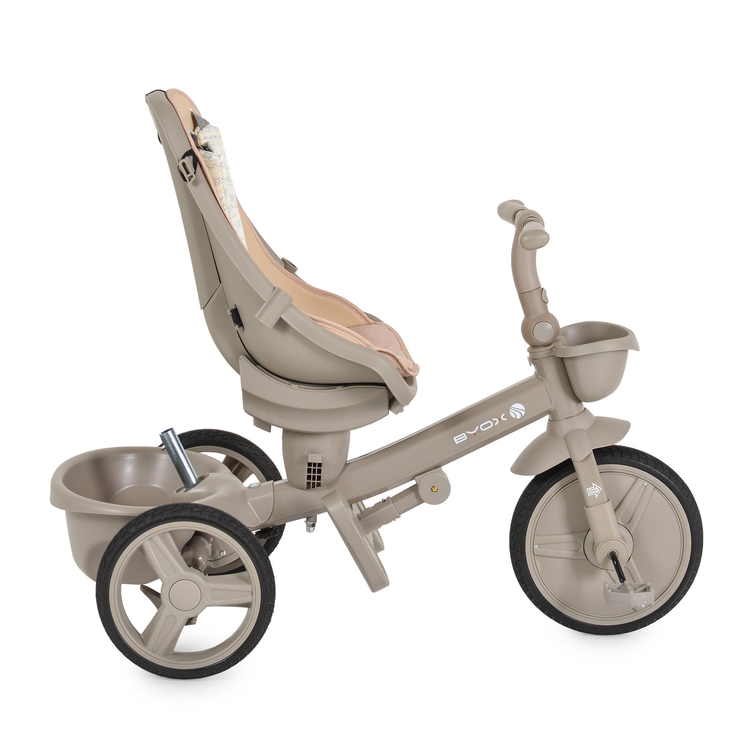 For children from 1 to 5 years of age and with maximum weight of 25 kg. PU wheels – front 12 inch, rear – 10 inch. Front wheel with free wheel function – the front wheel can move feely, but the pedals are fixed and cannot control the wheel. Adjustable parent pushbar, controling the direction of movement of the front wheel. Foldable handlebar; With 2 footrests – one for smaller children and one for bigger children. Adjustable canopy; Rotating seat in 360°; Backrest – reclinable to several laying positions; With soft safety bar; removable seat cushion, 3-point seat belts, 2 rear brakes.