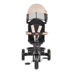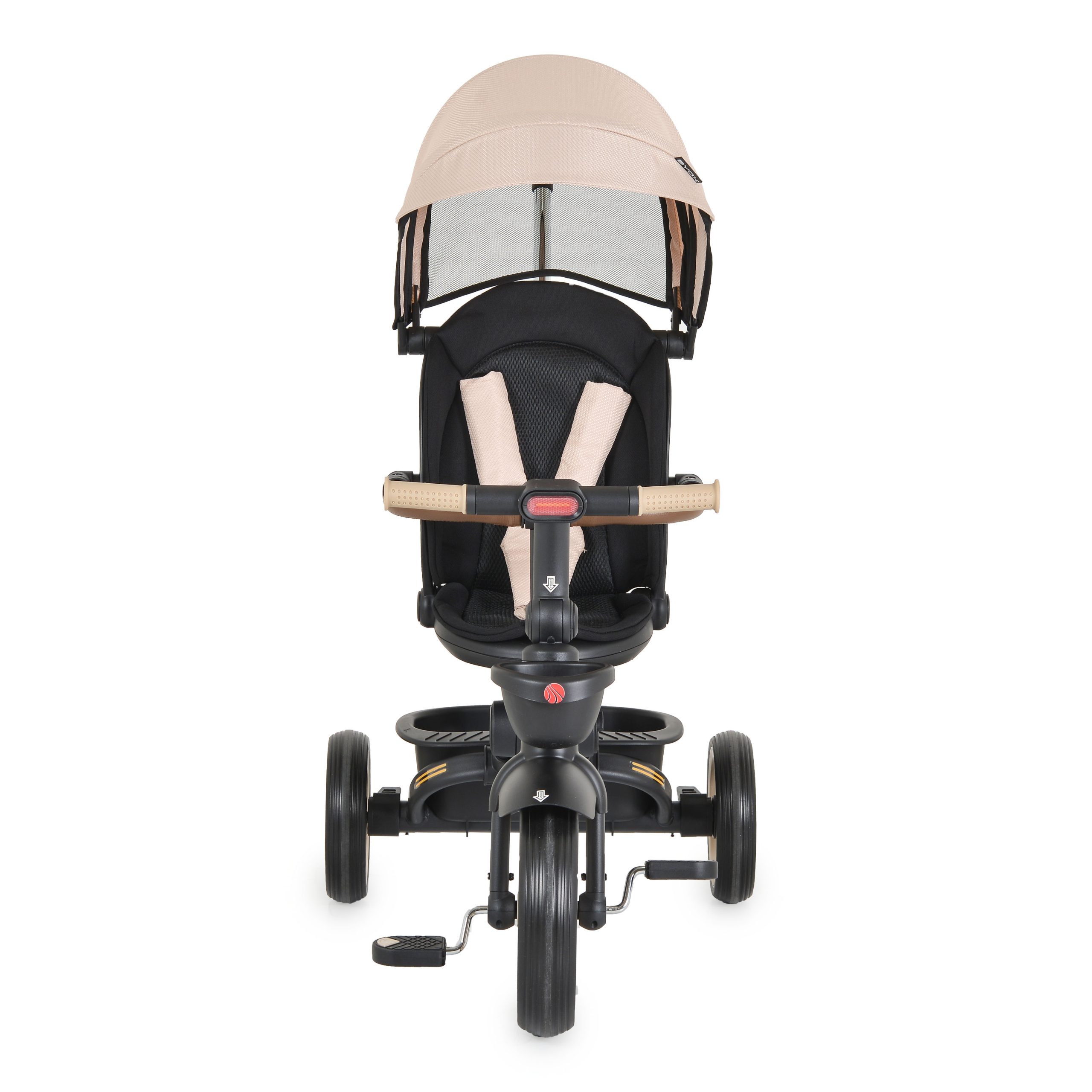 For children above 10 months of age with maximum weight of up to 25 kg. Can be used without the canopy and parent control handle. Foldable rear frame. Foldable handlebar with front lights. Seat: rotating in 360°; adjustable backrest. Parent pushbar – adjustable, controlling the direction of movement of the front wheel. Wheels – Front 12-inch EVA and rear 10-inch EVA. The pedals can be used in 2 positions – 1st position not controlling the front wheel (FREE WHEEL FUNCTION) and 2nd position controlling the front wheel. The pedals can also be used as foot rests for smaller children. PU safety bar. One rear brake that can block both of the rear wheels. Front and rear baskets.